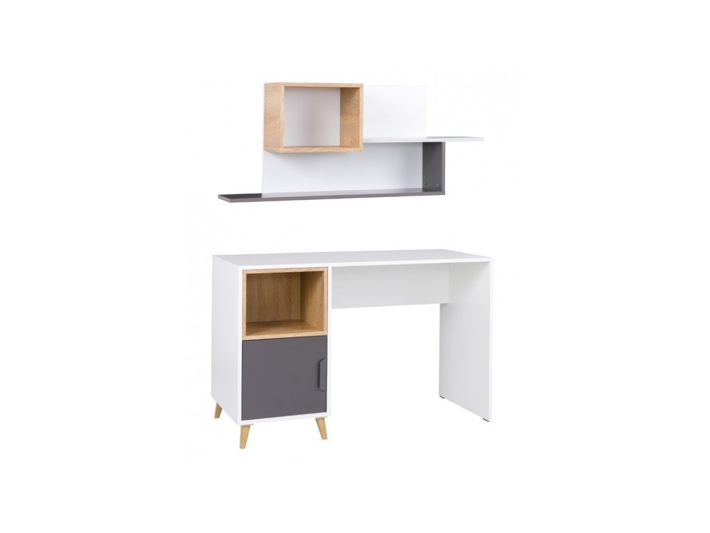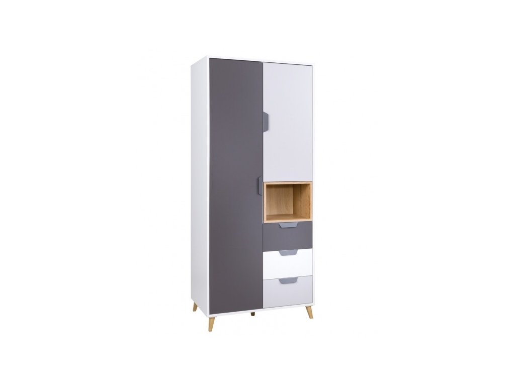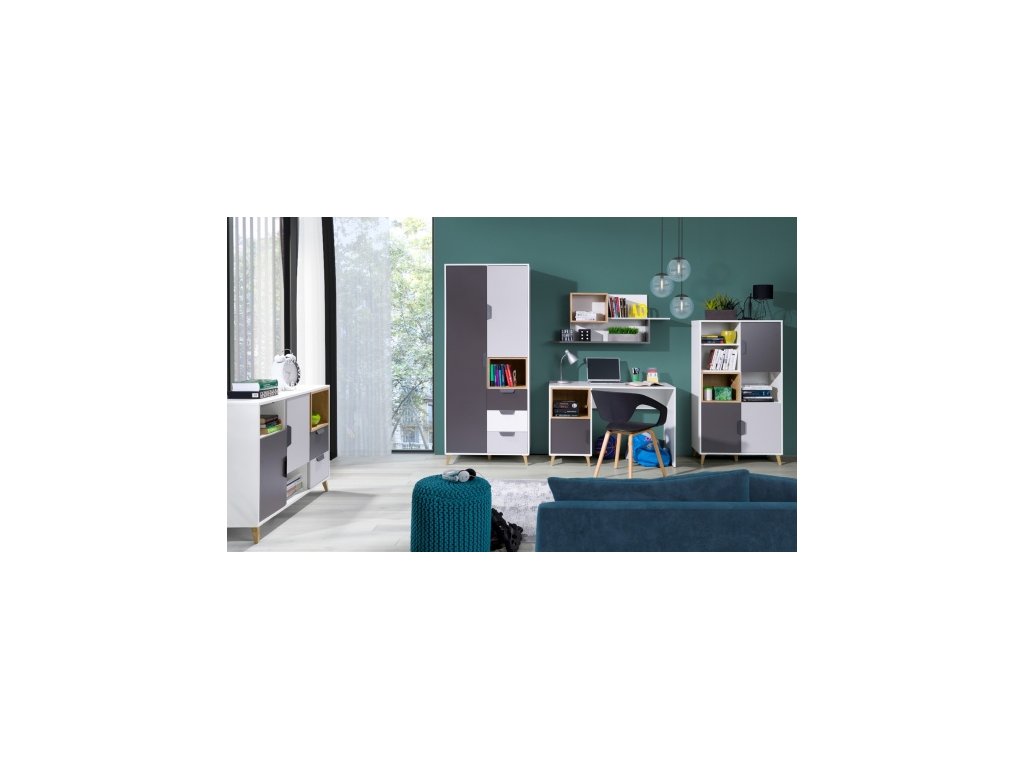Kolekce dětského pokoje Joker je moderní nábytek charakteristický především svými nožkami. Tento dětský sektor, který má korpus v bílé barvě, je doplněn o odstín šedé, grafit a dub lefkas. Pro inspiraci jsme připravili několik sestav, avšak komponenty je možné zakoupit i jednotlivě, takže můžete vytvořit dětský pokoj dle své vlastní představy. Nábytek je vyroben z kvalitního lamina a odolnost při každodenním použití zajišťují ABS hrany.