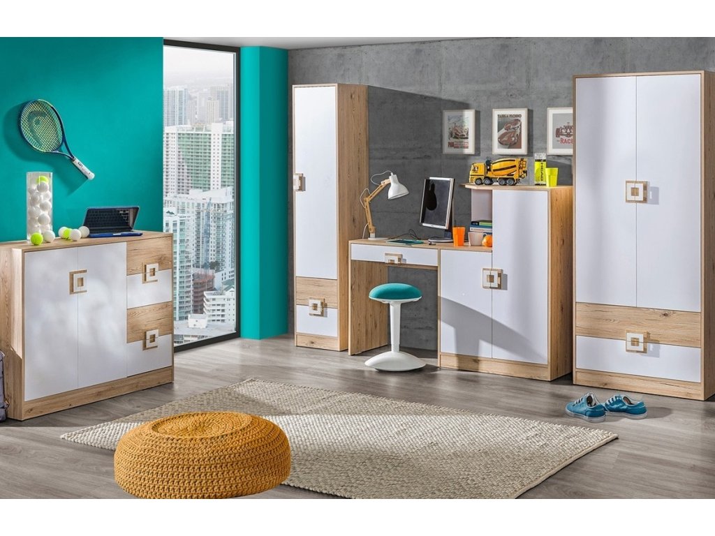 Dětský pokoj Nico je moderní nábytek, určený hlavně pro děti a dospívající mládež. Předností tohoto sektoru jsou zajímavé úchyty, které Vás ohromí na první pohled. Z jednotlivých dílů si snadno sestavíte pokoj přesně podle přání a představ Vašeho dítka. Nábytek je vyroben z vysoce kvalitní laminované dřevotřísky, která se dobře udržuje a je odolná vůči poškrábání a vlhkosti. Všechny hrany jsou opatřeny ABS lištou, která zajistí trvanlivost a odolnost proti nárazu.