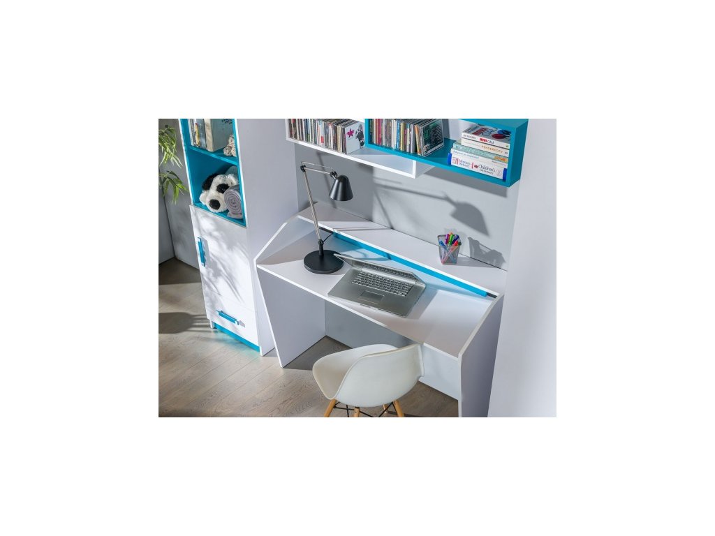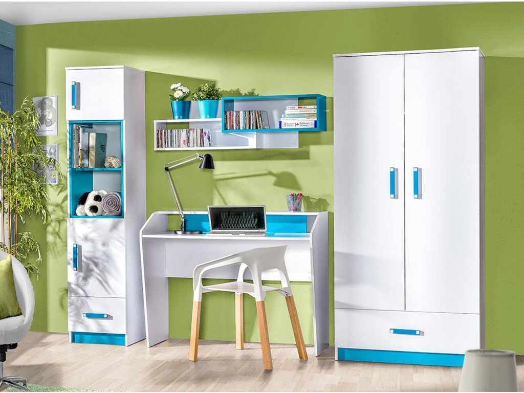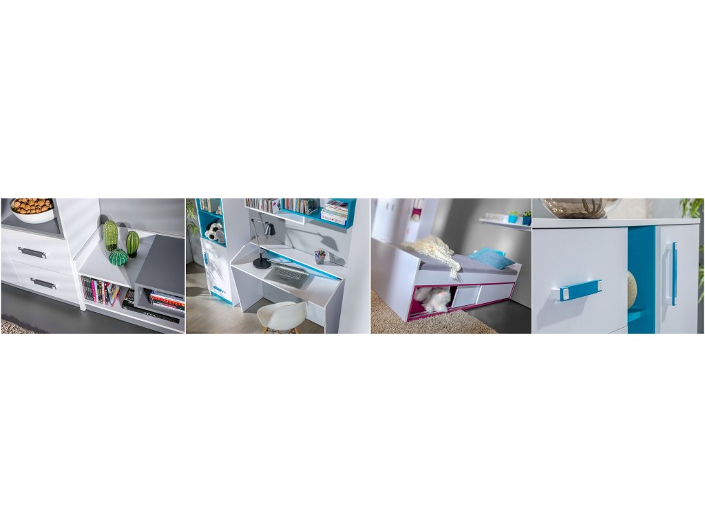 korpus: bílá + dvířka: bílá + dodatky: tyrkys
