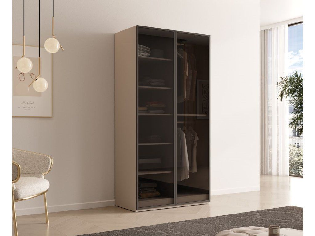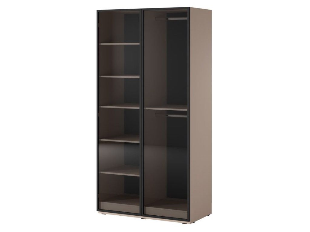 Kolekce SANDBOX představuje moderní a vysoce variabilní systém šatních skříní, který sází na minimalistický design, tmavé korpusy a kombinaci různých textur předních ploch. Systém je unikátní možností výběru ze čtyř různých stylů dveří, které zcela změní vzhled skříně. Skříně jsou modulární. Můžete je řadit vedle sebe a kombinovat různé typy dveří (např. kombinace dřevěného dekoru Sento a skla Antisol). Jako volitelné příslušenství je k dispozici LED osvětlení, které vynikne zejména u prosklených variant (Antisol/Flutes). Pokud chcete, aby místnost působila luxusně, doporučuji kombinaci dvou plných skříní (Nova/Sento) po stranách a jedné prosklené (Flutes) uprostřed s LED podsvícením.