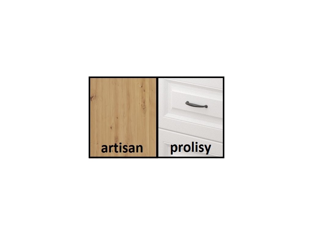 Tento stylový nábytek dodá Vašemu interiéru zajímavý vzhled a zaslouženou pozornost. Přední části, které jsou vyrobeny z desek MDF bílý mat s prolisy, jsou atraktivním prvkem tohoto nábytku. Korpus má odstín dub Artisan, hrany jsou zakončeny lištou ABS a úchytky tohoto sektoru jsou kovové.
