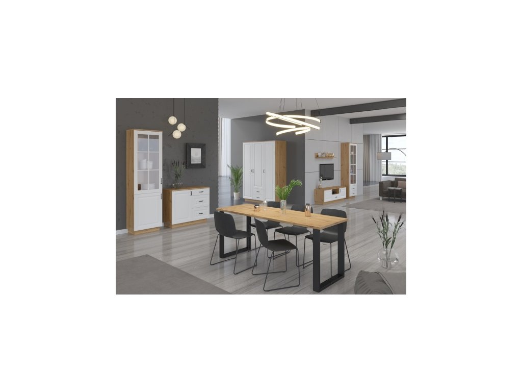 Tento stylový nábytek dodá Vašemu interiéru zajímavý vzhled a zaslouženou pozornost. Přední části, které jsou vyrobeny z desek MDF bílý mat s prolisy, jsou atraktivním prvkem tohoto nábytku. Korpus má odstín dub Artisan, hrany jsou zakončeny lištou ABS a úchytky tohoto sektoru jsou kovové.