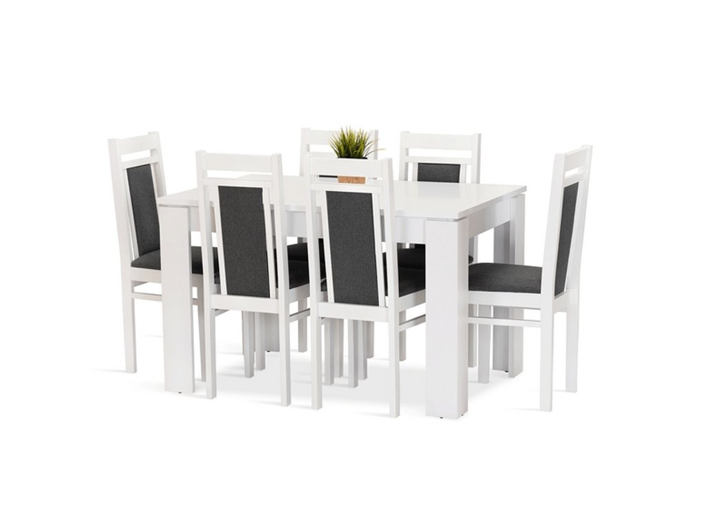Jídelní sestava Akord 6 se skládá ze stolu a šesti židlí. Tato jídelní sestava splní svůj účel na výbornou nejen v kuchyni, ale i v jídelně, nebo obývacím pokoji s jídelním koutem. Svou vysokou kvalitou a precizním zpracováním, uspokojí všechny budoucí, i ty velmi náročné, uživatele. Stůl je vyrobený z bílého matného lamina tl.22 mm, kostry židlí z bukového dřeva, barveného na bílou barvu. Jídelní sestava je dodávaná v demontu. Součástí balení je schématický montážní návod, včetně všech potřebných spojovacích prvků. Cena je uvedena za jídelní stůl a 6 židlí.