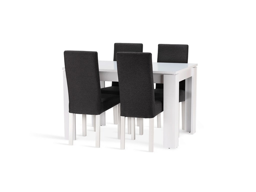 Jídelní sestava Neon 4 se skládá ze stolu a čtyř židlí. Tato jídelní sestava svou vysokou kvalitou a precizním zpracováním uspokojí všechny budoucí uživatele. Stůl je vyrobený z bílého matného lamina tl.22 mm, kostry židlí z bukového dřeva, barveného na bílou barvu. Jídelní sestava je dodávaná v demontu. Součástí balení je schématický montážní návod, včetně všech potřebných spojovacích prvků. Cena je uvedena za jídelní stůl a 4 židle. Úvodní fotografie je ilustrační. Židle budou dodány v modré barvě.