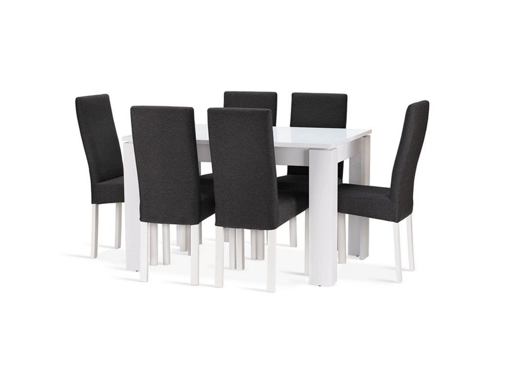 Jídelní sestava Neon 6 se skládá ze stolu a šesti židlí. Tato jídelní sestava svou vysokou kvalitou a precizním zpracováním uspokojí všechny budoucí uživatele. Stůl je vyrobený z bílého matného lamina tl.22 mm, kostry židlí z bukového dřeva, barveného na bílou barvu. Jídelní sestava je dodávaná v demontu. Součástí balení je schématický montážní návod, včetně všech potřebných spojovacích prvků. Cena je uvedena za jídelní stůl a 6 židlí.