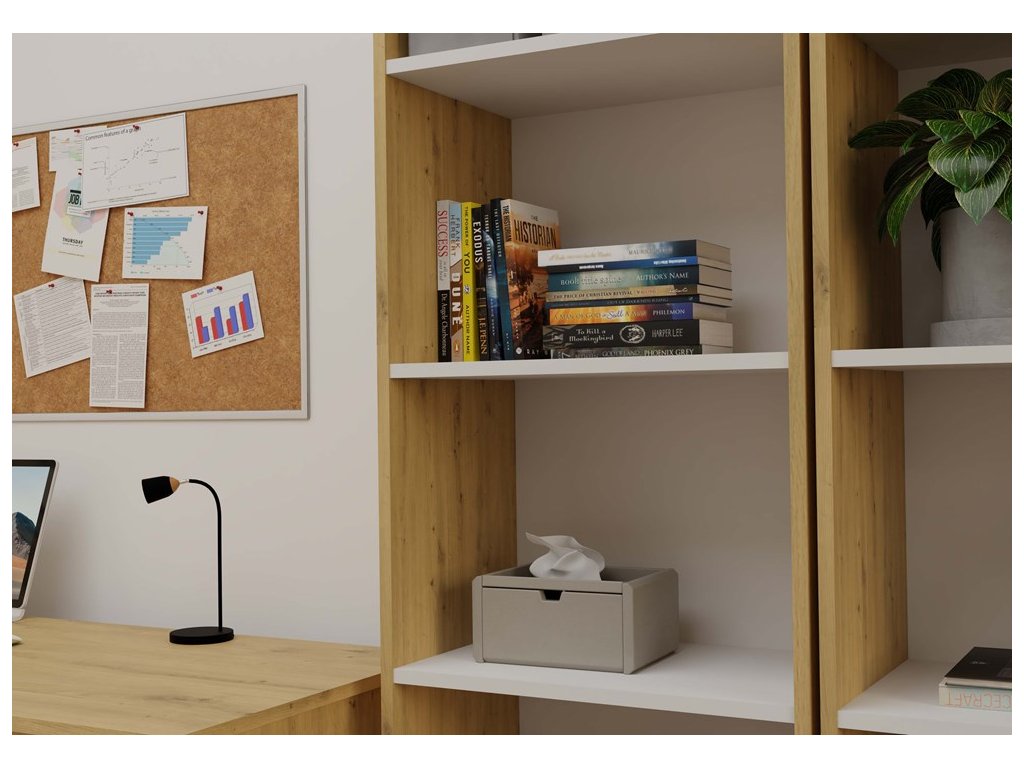 Nadčasové knihovny v trendy barvách série Malvína najdou díky své všestrannosti uplatnění jak v kanceláři, tak i v obývacích prostorách vašeho bytu. Knihovna s praktickými policemi je perfektním řešením pro ukládání knih, hraček, dekorací i firemních materiálů. Nábytek je vyrobený z pevné oboustranně laminované desky, hrany jsou povrchově upraveny ABS plastem - vyznačují se vysokou mechanickou a chemickou odolností.