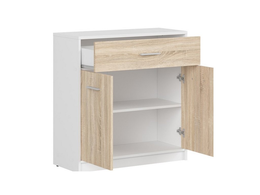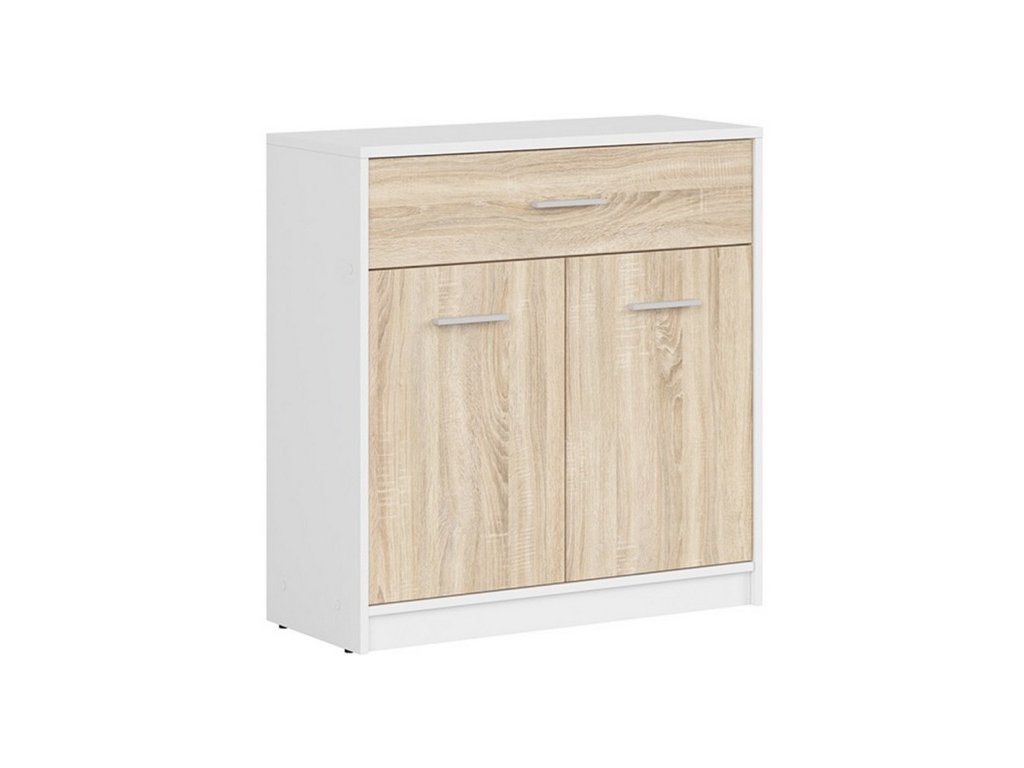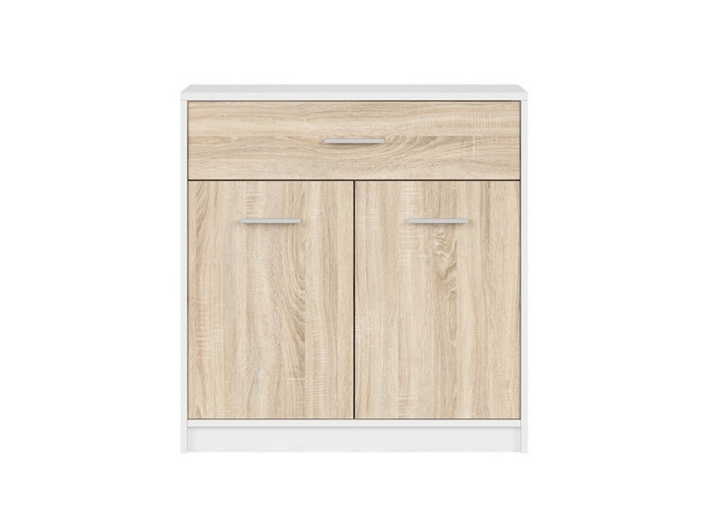 Moderní, nebo klasicky zařízený interiér? S komodou NEPO PLUS si hravě poradíte s oběma typy. Nábytek je vyroben z lamina v barevném provedení bílá/dub sonoma. Úložný prostor je v podobě zásuvky a police uschované za dvířky. Dvířka jsou opatřena stříbrnou plastovou úchytkou. Dodáváno v demontu.