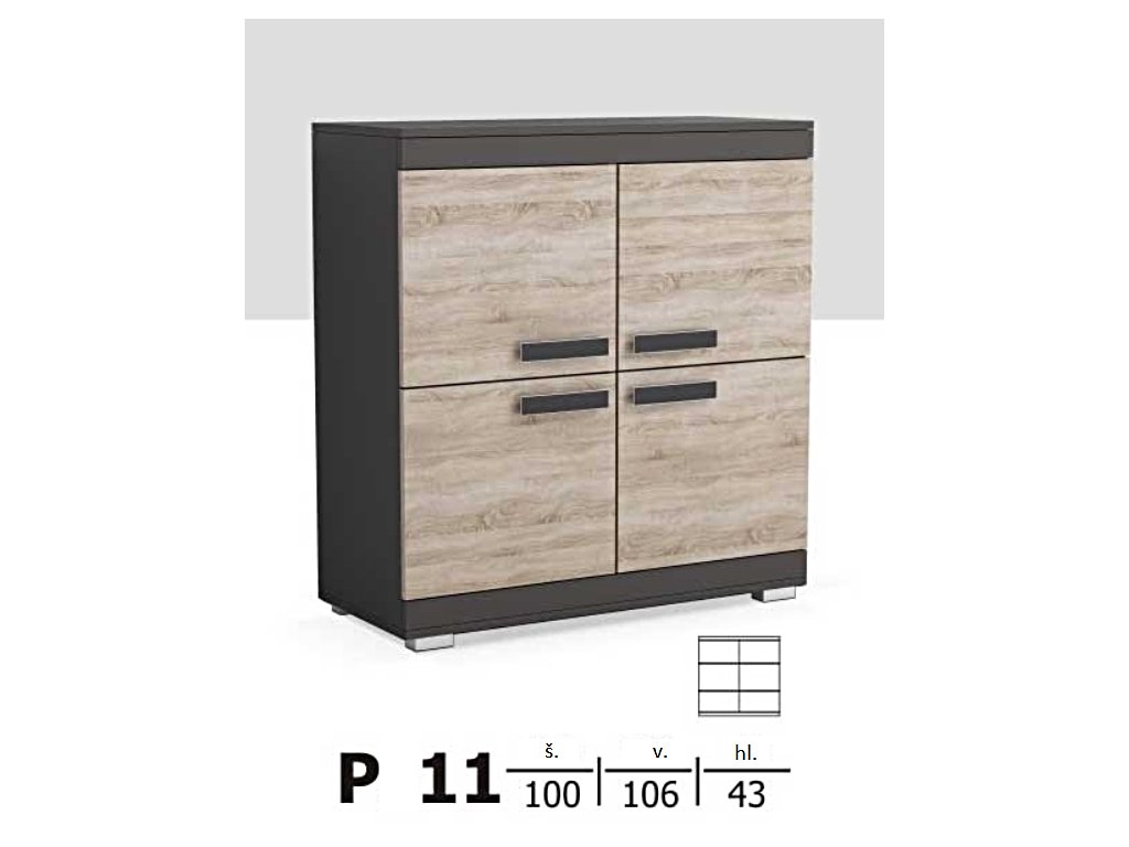 Moderní, univerzální nábytkový systém, kde si můžete vybírat z velkého množství jednotlivých dílů. Kolekce je vyrobena z dřevotřískové laminované desky o tloušťce 18 mm. Ze sektoru můžete sestavit obývací stěnu, studentský pokoj, jídelnu, pracovnu nebo předsíňovou stěnu. Lze zvolit jiné barevné provedení korpusu, dvířek a lišty. Nábytek Petr "P" zajistí pohodlný i praktický interiér a útulné a bezpečné prostředí ve Vašem domově.