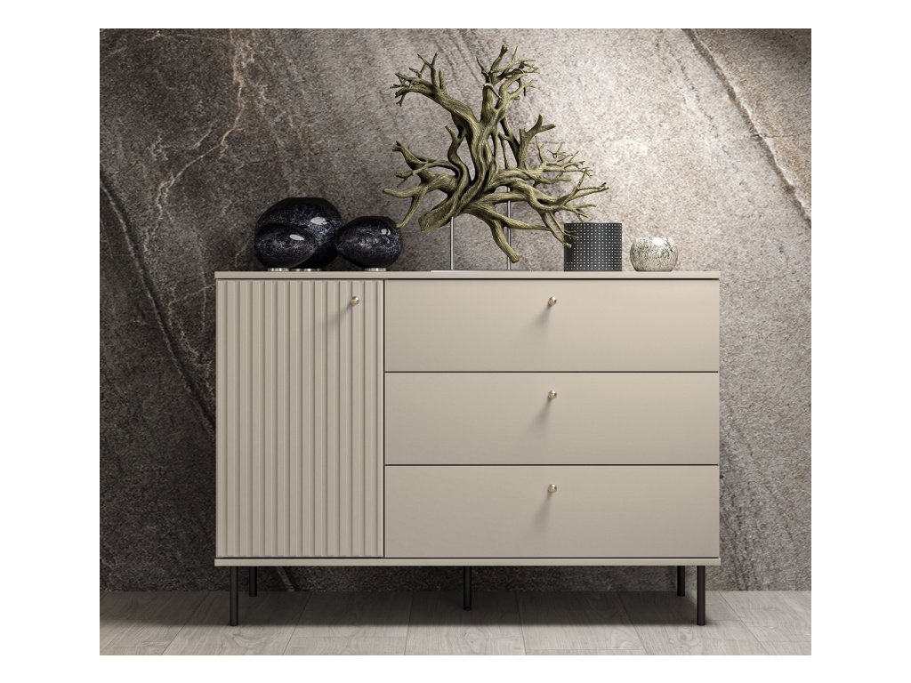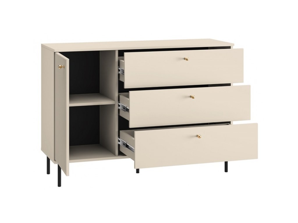 Nábytek z kolekce Sophie je perfektní volbou do moderního obývacího pokoje, ložnice nebo haly. Díky systému složenému z mnoha prvků si můžete zařídit svůj vysněný interiér. Kašmírový dekor je originální a nadčasová barva nazývaná nová bílá. Frézovaná čela z MDF zdůrazňují sofistikovanost a eleganci celé kolekce. Decentní černé nohy dodávají tvarům působivou lehkost. Vrcholem, který navíc umocňuje estetiku veškerého nábytku Sophie, jsou úchytky z broušeného kovu zlaté barvy.