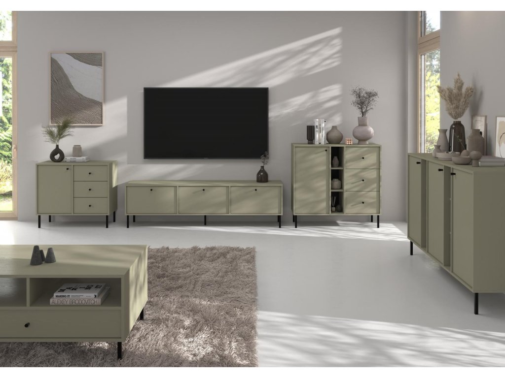 Série Tomila nabízí noční, TV i konferenční stolky, vitríny a komody v široké škále tvarů, barev a typů noh.