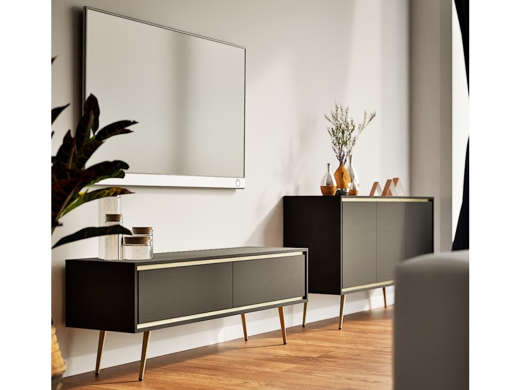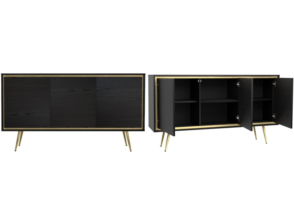 třídvéřová komoda na vysokých nochách je vhodná do obývacího pokoje i do ložnice. Nabízí dostatek úložného prostoru. Moderní barva černý grafit je osvěžená zlatou.