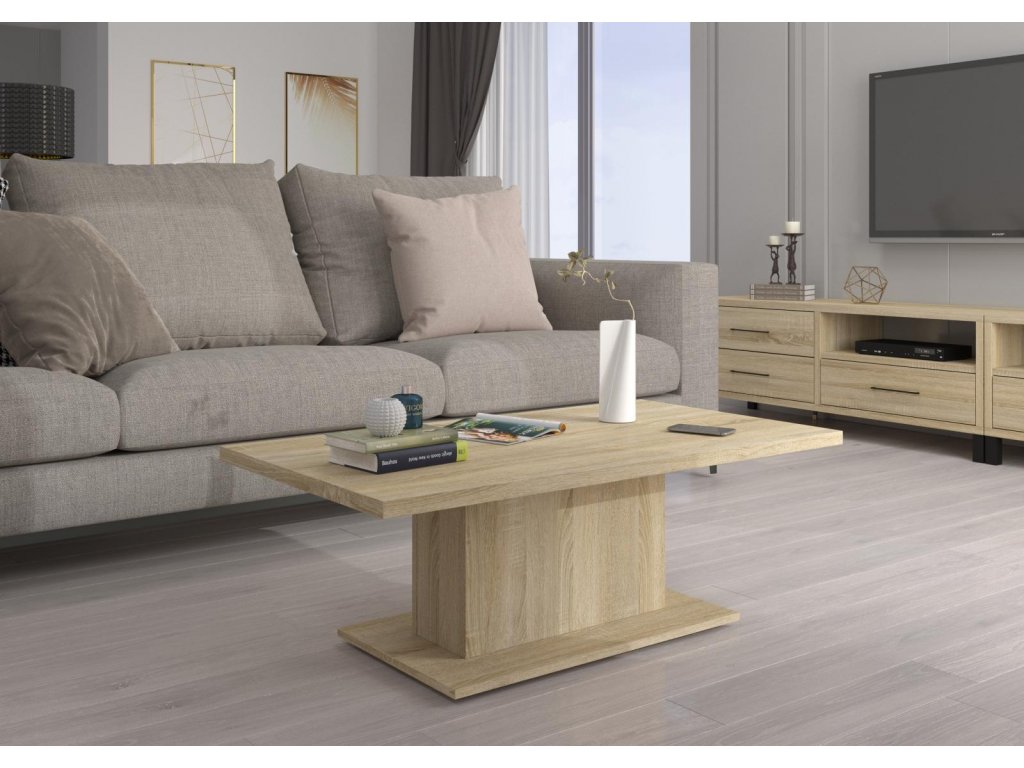 Konferenční stolek Denis je atraktivní stolek, který je vyrobený z lamina ve velmi oblíbeném a moderním dekoru dub sonoma. Stolek je dostatečně velký na vše, co si budete potřebovat odložit. Hrnek s kávou nebo čajem, talíř, knihu, telefon, notebook, nebo klidně i unavené nohy po celodenním maratonu. Stolek je dodávaný v demontu. Součástí balení je montážní plánek včetně všech potřebných spojovacích materiálů. Vyobrazené doplňky a dekorace nejsou v ceně.
