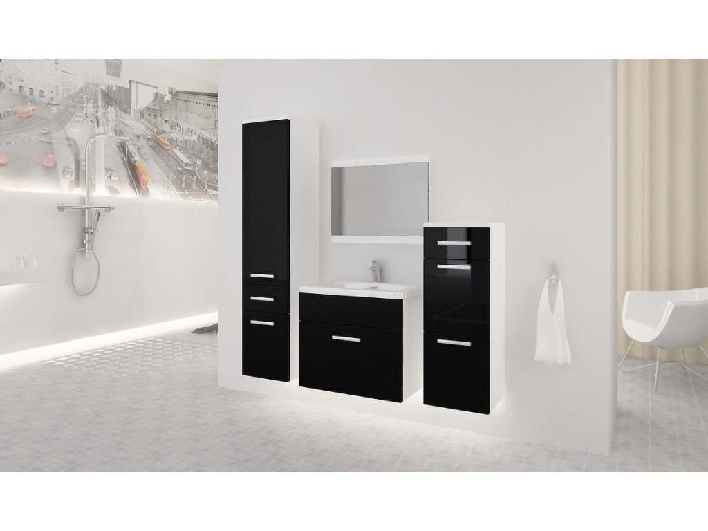Moderní a jednoduchá koupelnová sestava, která splní svůj praktický i dekorativní účel. Sestava se skládá ze dvou závěsných skříněk, zrcadla a skříňky pod umyvadlo včetně umyvadla. Koupelnová sestava má plastové úchyty v šedé barvě. Dvířka jsou vyrobena v lesku z lamina tloušťky 16 mm v černé barvě, korpusy jsou v bílém provedení MAT tloušťky lamina 18 mm. Zboží je dodáváno v demontu se schematickým návodem k montáži. Vyobrazené dekorace nejsou v ceně sestavy. Sestavu nabízíme také v dalších barevných provedeních, které jsou k vidění na vedlejších fotografiích.