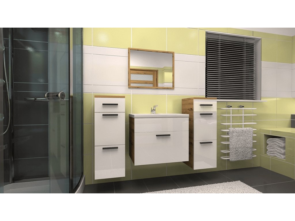 Moderní a jednoduchá koupelnová sestava, která splní svůj praktický i dekorativní účel. Sestava se skládá ze dvou závěsných skříněk, zrcadla a skříňky pod umyvadlo včetně umyvadla. Koupelnová sestava má plastové úchyty v černé barvě. Je vyrobena z lamina tloušťky 18 mm v barvě dvířek bílý lesk, korpusy jsou v dekóru dub artisan. Zboží je dodáváno v demontu se schematickým návodem k montáži.