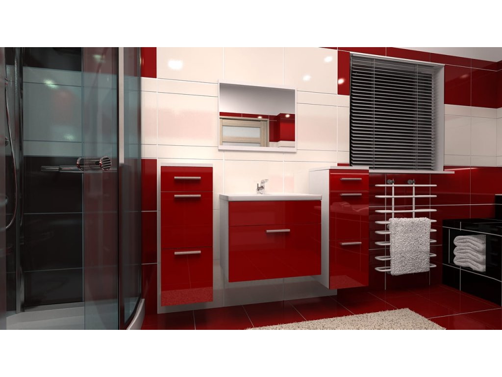 Moderní a jednoduchá koupelnová sestava, která splní svůj praktický i dekorativní účel. Sestava se skládá ze dvou závěsných skříněk, zrcadla a skříňky pod umyvadlo včetně umyvadla. Koupelnová sestava má plastové úchyty v šedé barvě. Dvířka jsou vyrobena v lesku z lamina tloušťky 16 mm v červené barvě, korpusy jsou v bílém provedení MAT tloušťky lamina 18 mm Zboží je dodáváno v demontu se schematickým návodem k montáži. Vyobrazené dekorace nejsou v ceně sestavy. Sestavu nabízíme také v dalších barevných provedeních, které jsou k vidění na vedlejších fotografiích.