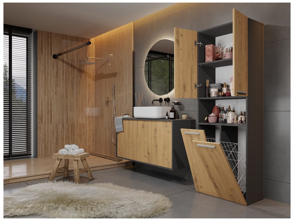 Stylová skříňka Noeli vám díky praktickému úložnému prostoru pomůže vytvořit dokonale organizovanou a útulnou koupelnu. Nadčasový design splní očekávání všech, kteří oceňují kombinaci jednoduchosti a elegance. Skříňka je vyrobená ze snadno udržovatelného lamina, hrany jsou povrchově upravené ABS plastem (vyznačuje se vysokou mechanickou a chemickou odolností).
