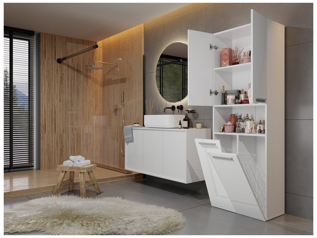 Stylová skříňka Noeli vám díky praktickému úložnému prostoru pomůže vytvořit dokonale organizovanou a útulnou koupelnu. Nadčasový design splní očekávání všech, kteří oceňují kombinaci jednoduchosti a elegance. Skříňka je vyrobená ze snadno udržovatelného lamina, hrany jsou povrchově upravené ABS plastem (vyznačuje se vysokou mechanickou a chemickou odolností).