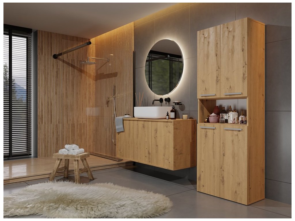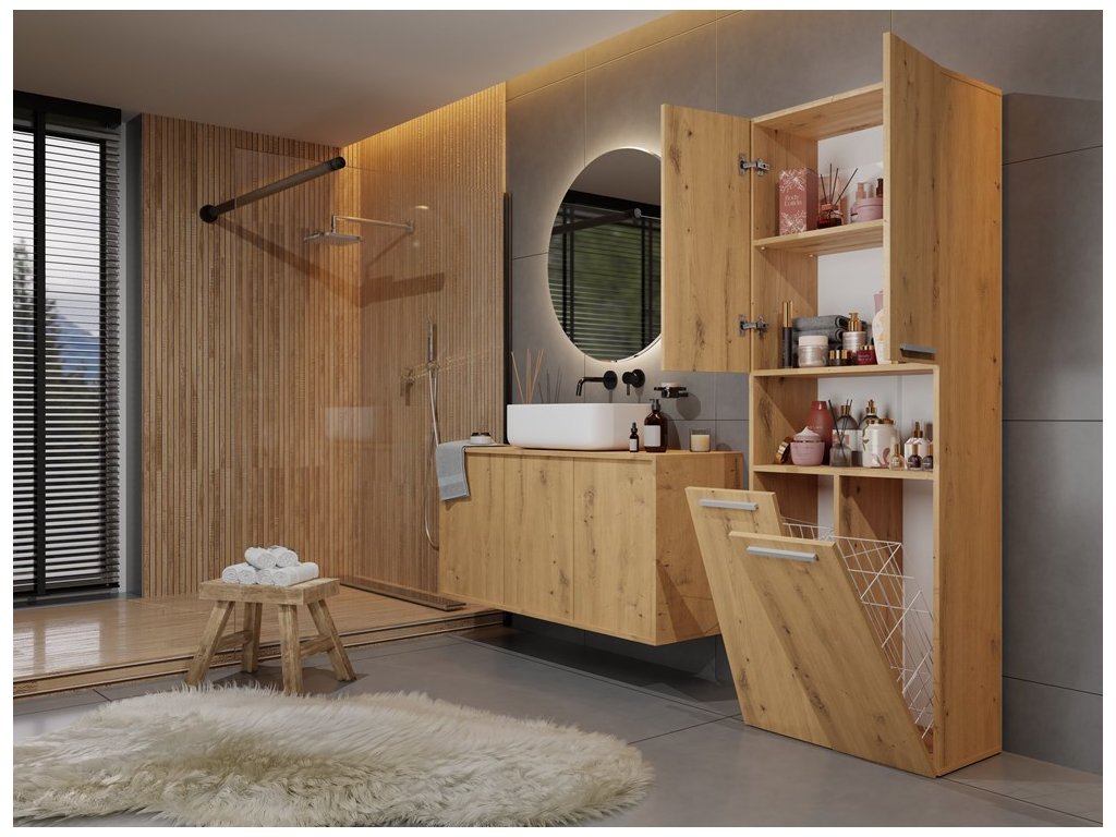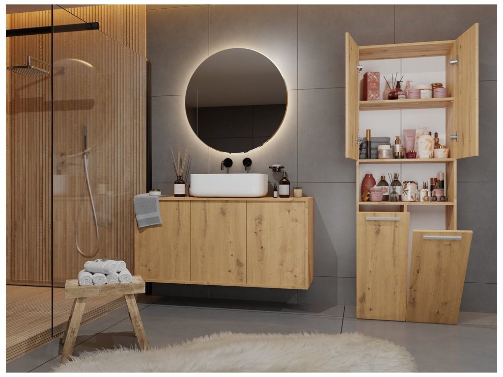 Stylová skříňka Noeli vám díky praktickému úložnému prostoru pomůže vytvořit dokonale organizovanou a útulnou koupelnu. Nadčasový design splní očekávání všech, kteří oceňují kombinaci jednoduchosti a elegance. Skříňka je vyrobená ze snadno udržovatelného lamina, hrany jsou povrchově upravené ABS plastem (vyznačuje se vysokou mechanickou a chemickou odolností).