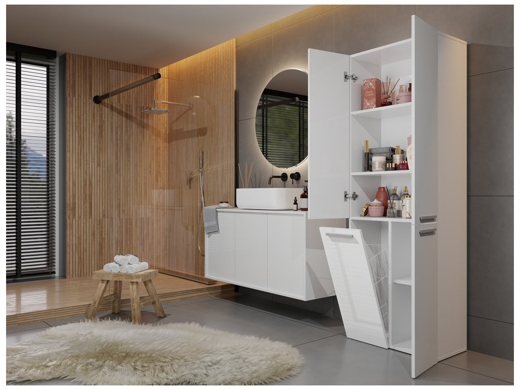 Stylová skříňka Noeli vám díky praktickému úložnému prostoru pomůže vytvořit dokonale organizovanou a útulnou koupelnu. Nadčasový design splní očekávání všech, kteří oceňují kombinaci jednoduchosti a elegance. Skříňka je vyrobená ze snadno udržovatelného lamina, hrany jsou povrchově upravené ABS plastem (vyznačuje se vysokou mechanickou a chemickou odolností).