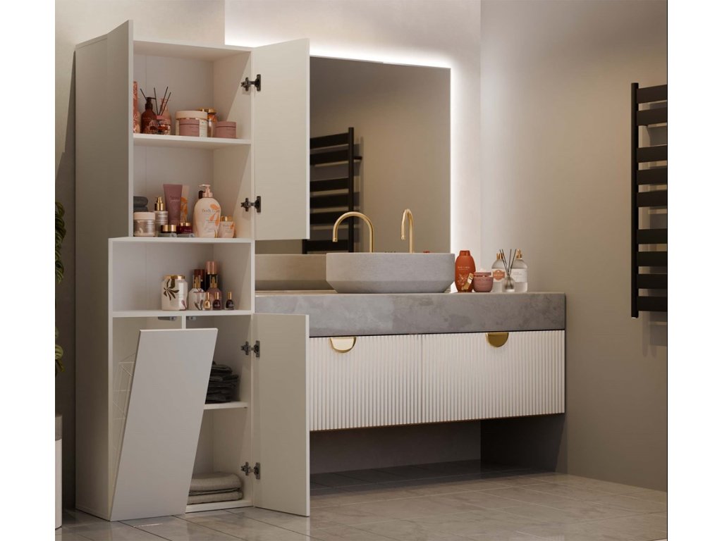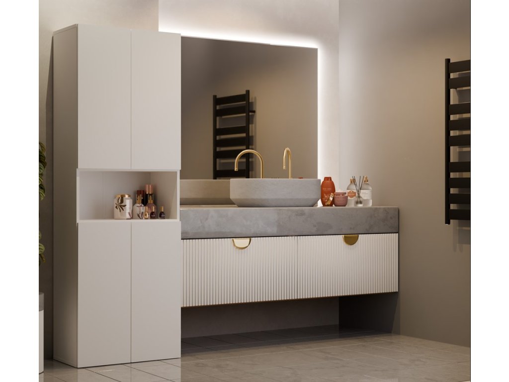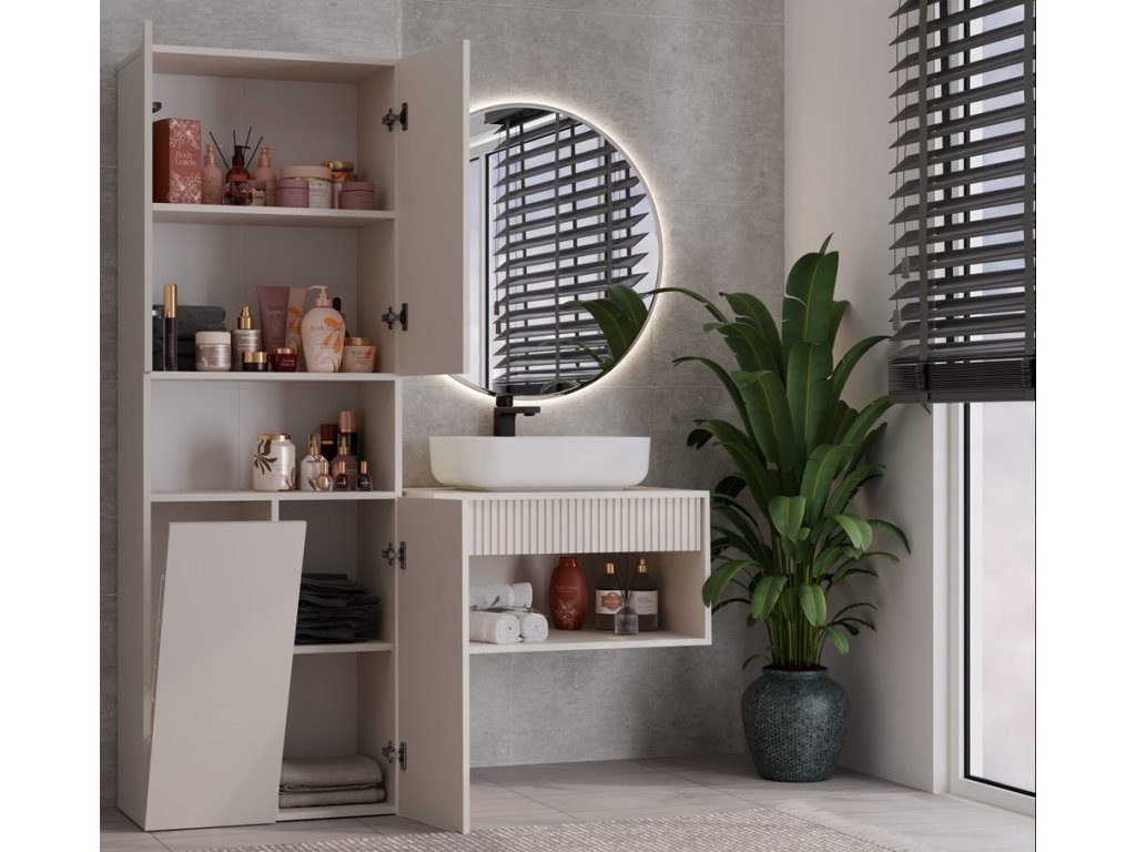 Stylová skříňka Noeli vám díky praktickému úložnému prostoru pomůže vytvořit dokonale organizovanou a útulnou koupelnu. Nadčasový design splní očekávání všech, kteří oceňují kombinaci jednoduchosti a elegance. Skříňka je vyrobená ze snadno udržovatelného lamina, hrany jsou povrchově upravené ABS plastem (vyznačuje se vysokou mechanickou a chemickou odolností). Systém TIP-ON - dvířka se otevírají po jemném zatlačení na čelo dvířek.