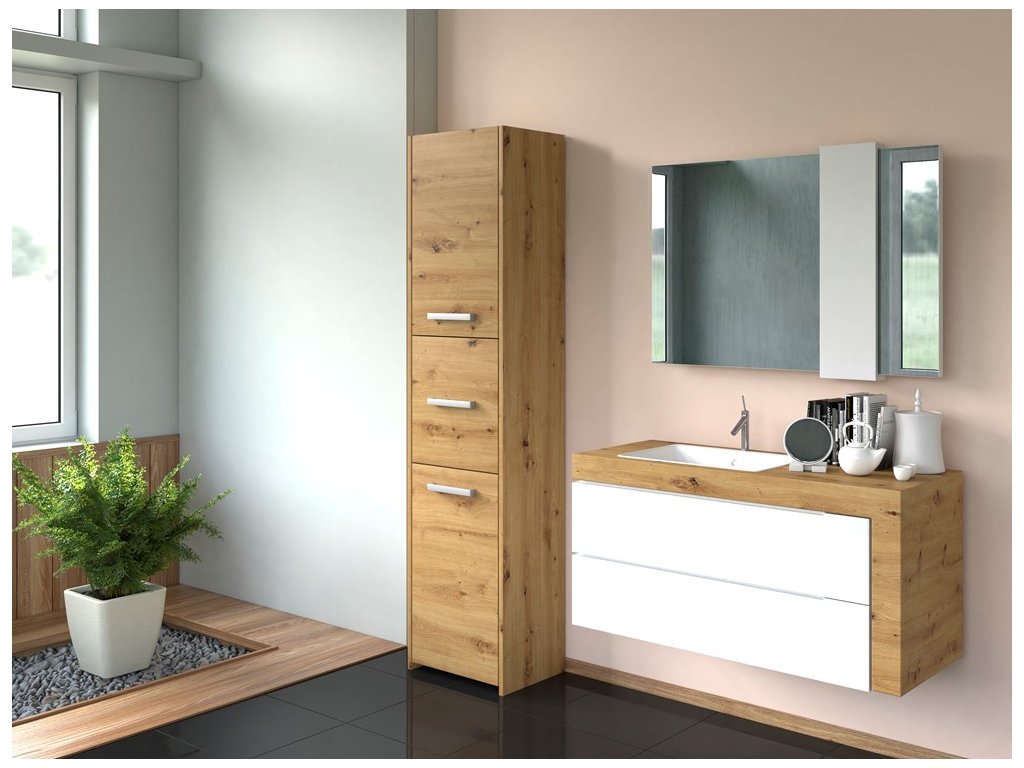 Vysokou koupelnovou skříňku Saly v minimalistickém designu ocení milovníci jednoduchosti a elegance. Je vyrobená ze snadno udržovatelného lamina, hrany jsou povrchově upravené ABS plastem - vyznačuje se vysokou mechanickou a chemickou odolností.