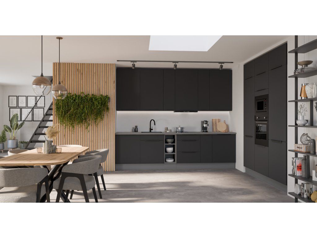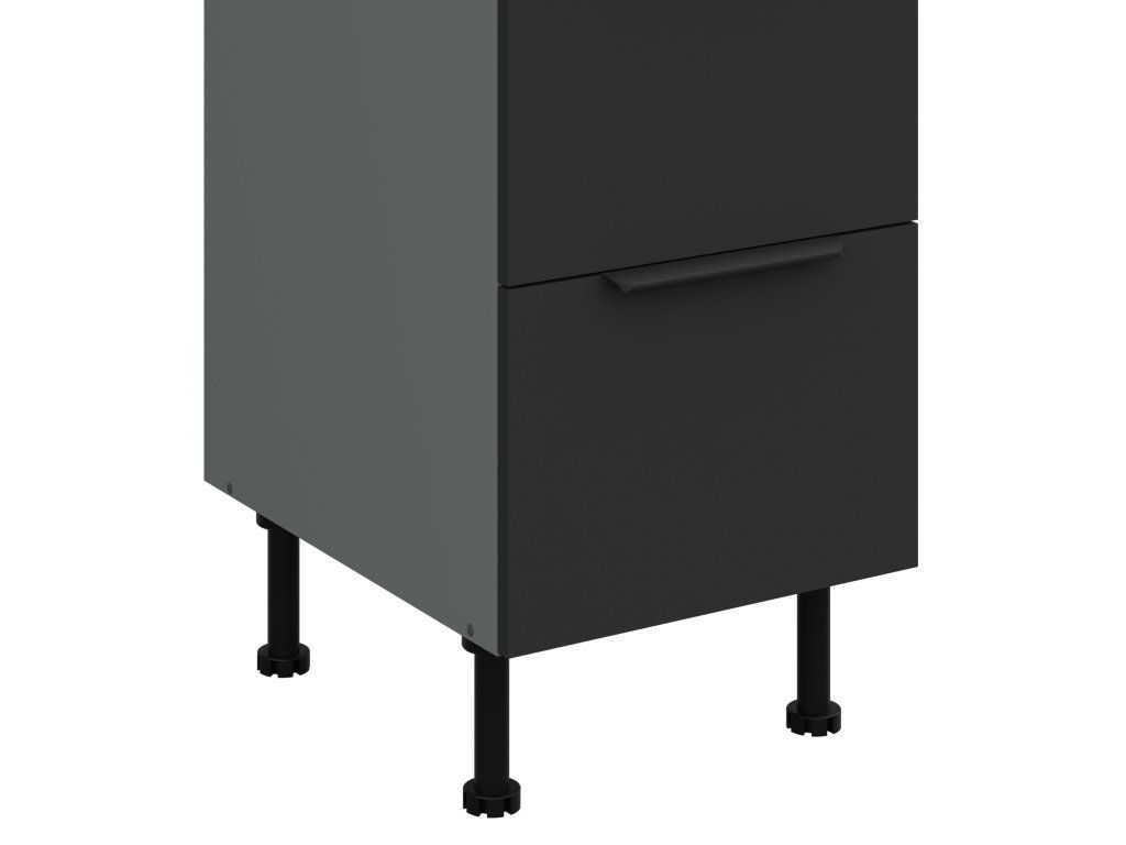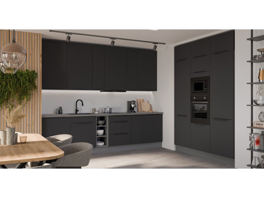 Moderní sektorová kuchyňská linka Aria BL/ANT je v barevném provedení Antracit (korpus) a černý mat (dvířka). Tato linka má atraktivní design díky moderním výškově nastavitelným nožkám a je tak ideální volbou při výběru Vaší kuchyně. U skříněk s výklopem se dvířka zvedají pomocí plynových pístů, Cargo skříňky jsou výsuvné, všechny ostatní skříňky (mimo rohových) a zásuvky jsou opatřeny SYSTÉMEM TICHÉHO DOVÍRÁNÍ. Úchytky jsou hliníkové černé. Na předních stranách tohoto nábytku (dvířka/zásuvky) má linka speciální povrchovou úpravu Anti Finger Print, nezanechávající otisky prstů.