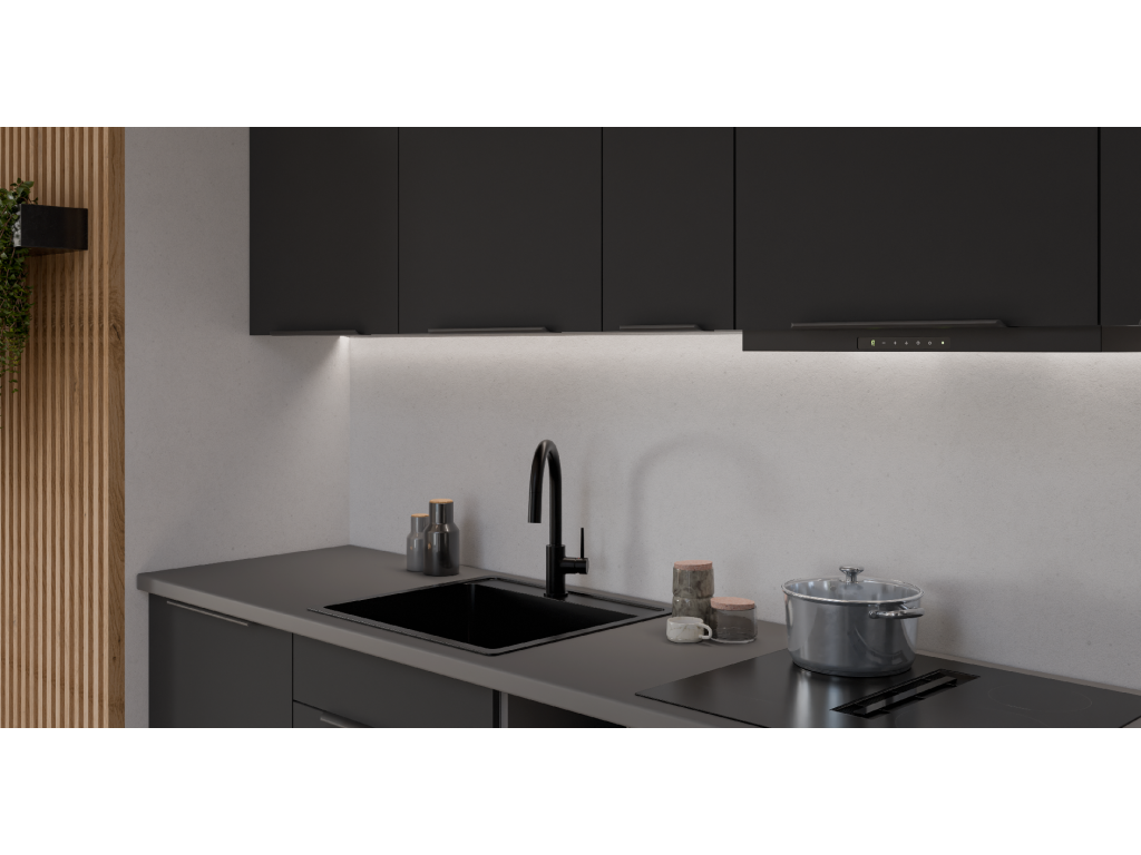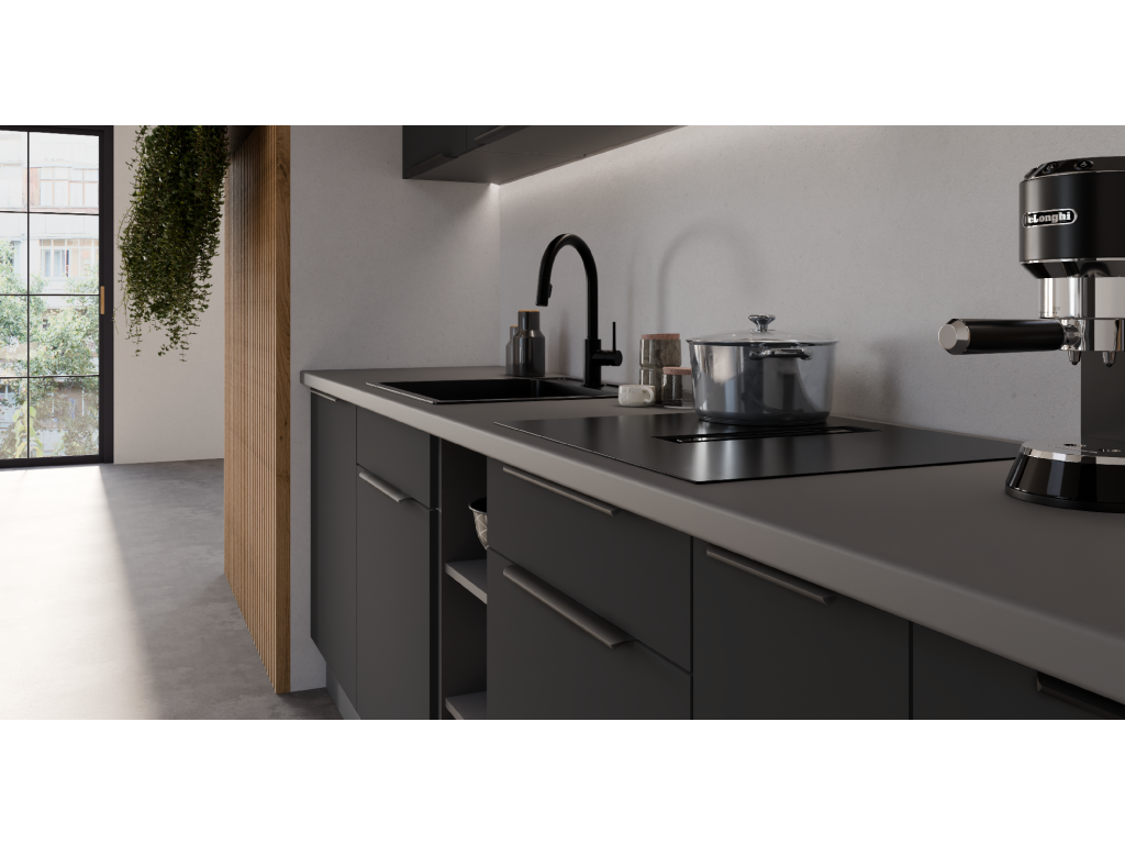 Moderní sektorová kuchyňská linka Aria BL/ANT je v barevném provedení Antracit (korpus) a černý mat (dvířka). Tato linka má atraktivní design díky moderním výškově nastavitelným nožkám a je tak ideální volbou při výběru Vaší kuchyně. U skříněk s výklopem se dvířka zvedají pomocí plynových pístů, Cargo skříňky jsou výsuvné, všechny ostatní skříňky (mimo rohových) a zásuvky jsou opatřeny SYSTÉMEM TICHÉHO DOVÍRÁNÍ. Úchytky jsou hliníkové černé. Na předních stranách tohoto nábytku (dvířka/zásuvky) má linka speciální povrchovou úpravu Anti Finger Print, nezanechávající otisky prstů.
