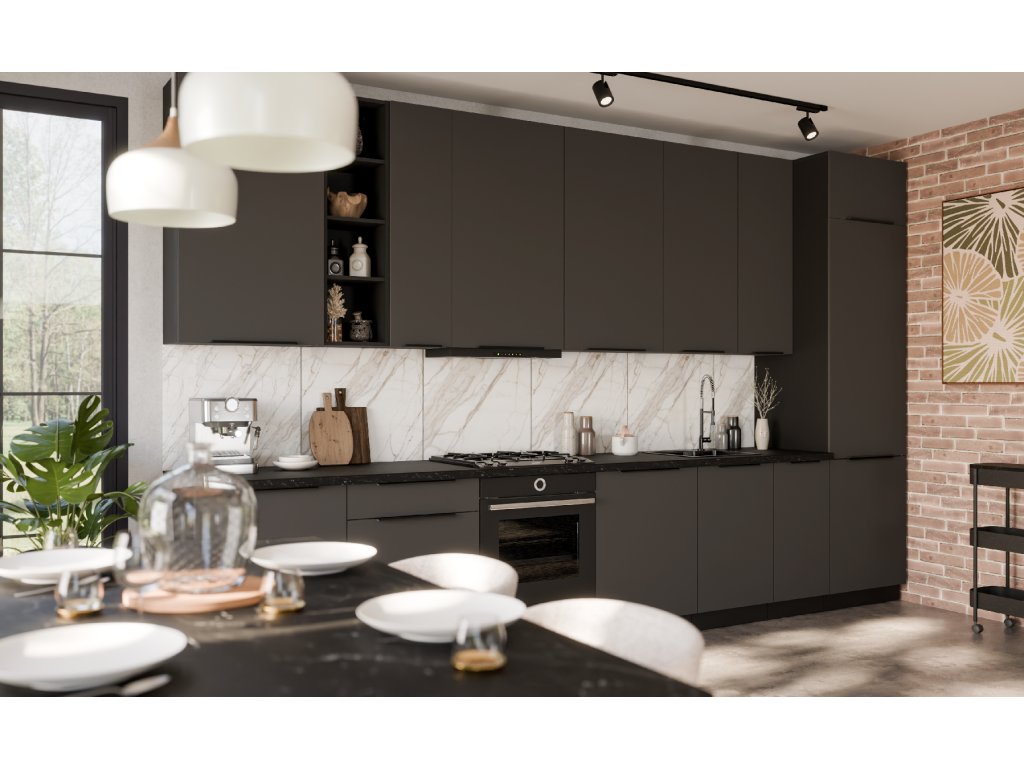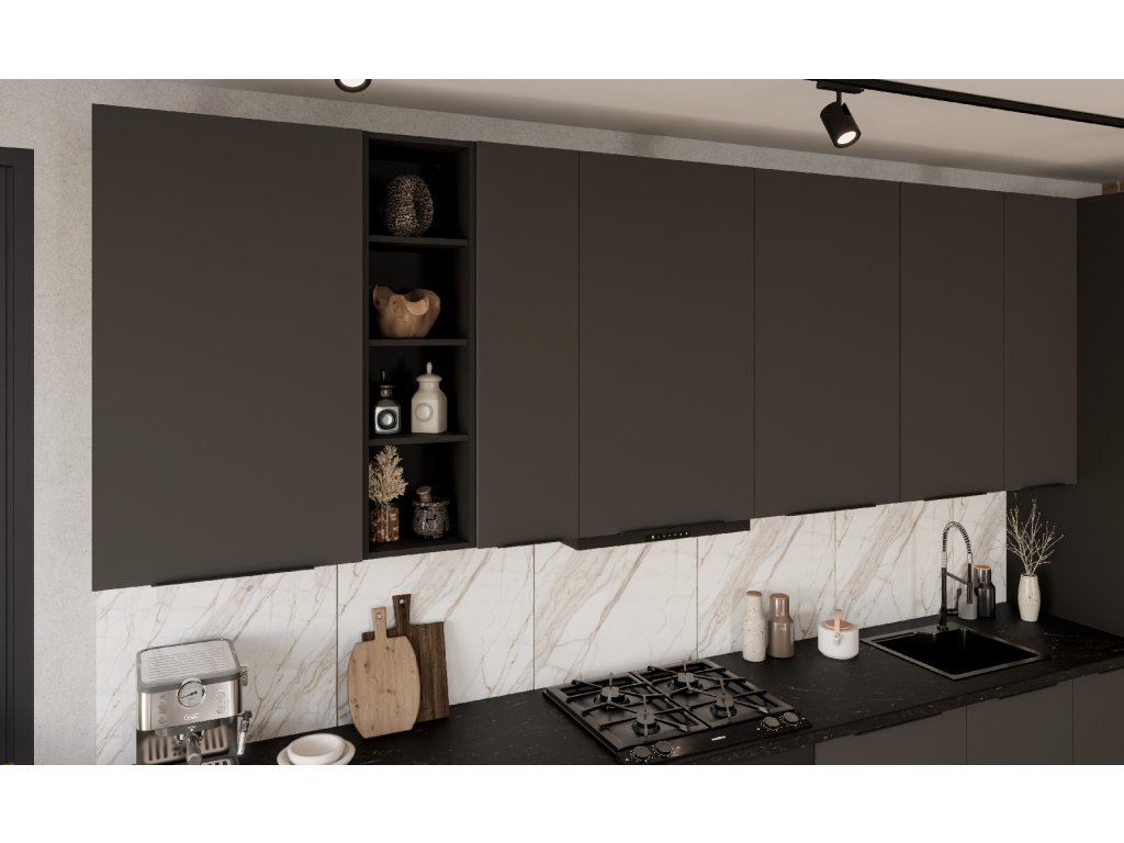 je součástí moderní sektorové kuchyňské linky Aria GR-BL, která je v barevném provedení černý mat (korpus) a Graphite (dvířka). U skříněk s výklopem se dvířka zvedají pomocí plynových pístů, Cargo skříňky jsou výsuvné, všechny ostatní skříňky (mimo rohových) a zásuvky jsou opatřeny SYSTÉMEM TICHÉHO DOVÍRÁNÍ. Úchytky jsou hliníkové černé. Na předních stranách tohoto nábytku (dvířka/zásuvky) má linka speciální povrchovou úpravu Anti Finger Print, nezanechávající otisky prstů.