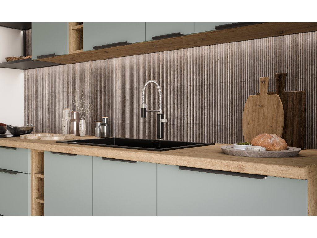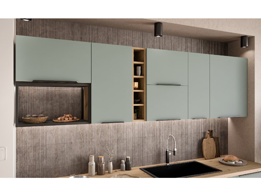 je součástí moderní sektorové kuchyňské linky Aria SA-AR, která je v barevném provedení dub Artisan (korpus) a Aquamarine (dvířka). U skříněk s výklopem se dvířka zvedají pomocí plynových pístů, Cargo skříňky jsou výsuvné, všechny ostatní skříňky (mimo rohových) a zásuvky jsou opatřeny SYSTÉMEM TICHÉHO DOVÍRÁNÍ. Úchytky jsou hliníkové černé. Na předních stranách tohoto nábytku (dvířka/zásuvky) má linka speciální povrchovou úpravu Anti Finger Print, nezanechávající otisky prstů.