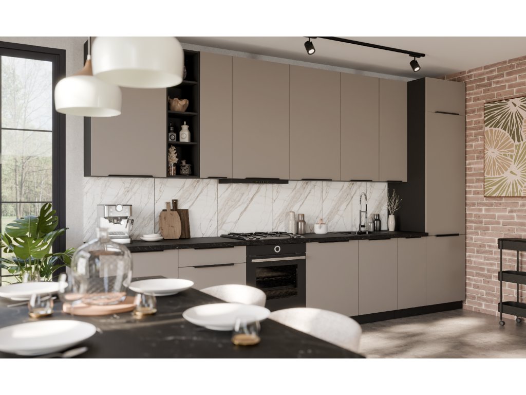 je součástí moderní sektorové kuchyňské linky Aria TA-BL, která je v barevném provedení černý mat (korpus) a Sandgrau (dvířka). U skříněk s výklopem se dvířka zvedají pomocí plynových pístů, Cargo skříňky jsou výsuvné, všechny ostatní skříňky (mimo rohových) a zásuvky jsou opatřeny SYSTÉMEM TICHÉHO DOVÍRÁNÍ. Úchytky jsou hliníkové černé. Na předních stranách tohoto nábytku (dvířka/zásuvky) má linka speciální povrchovou úpravu Anti Finger Print, nezanechávající otisky prstů.