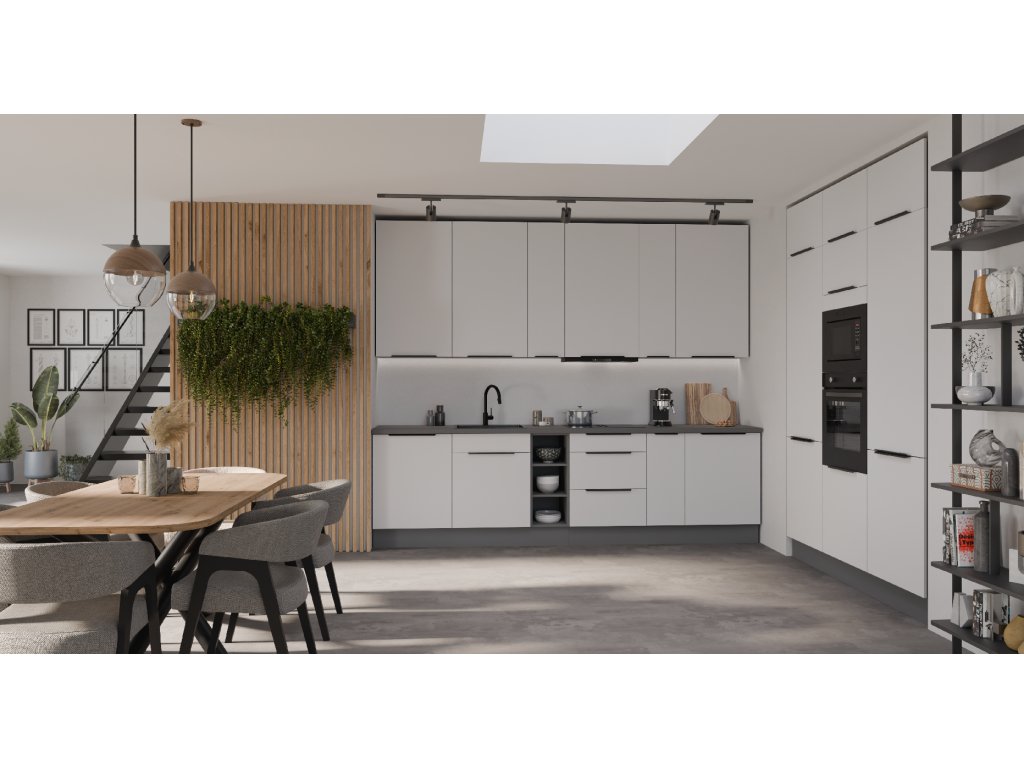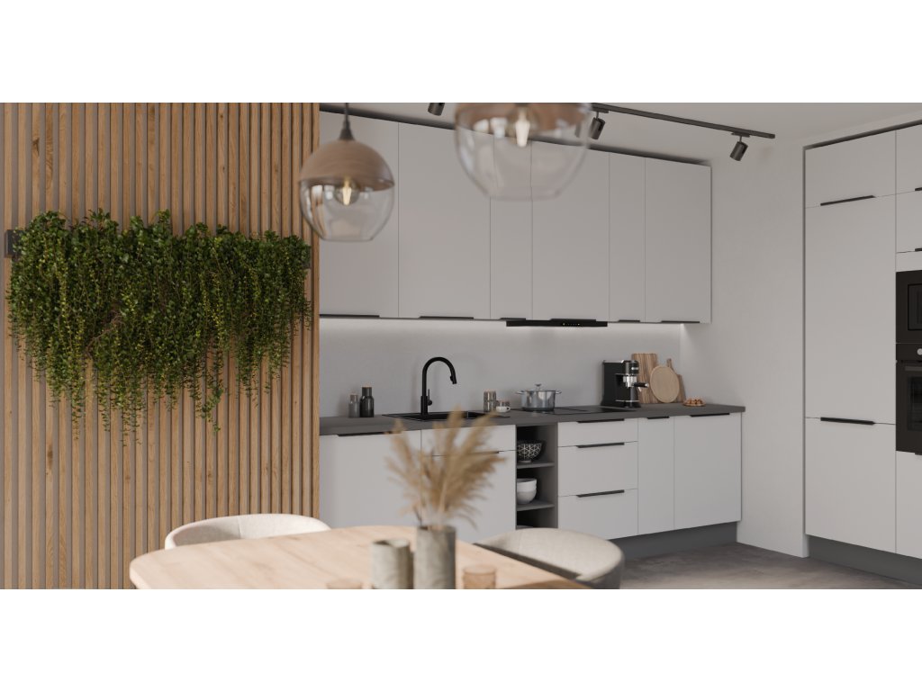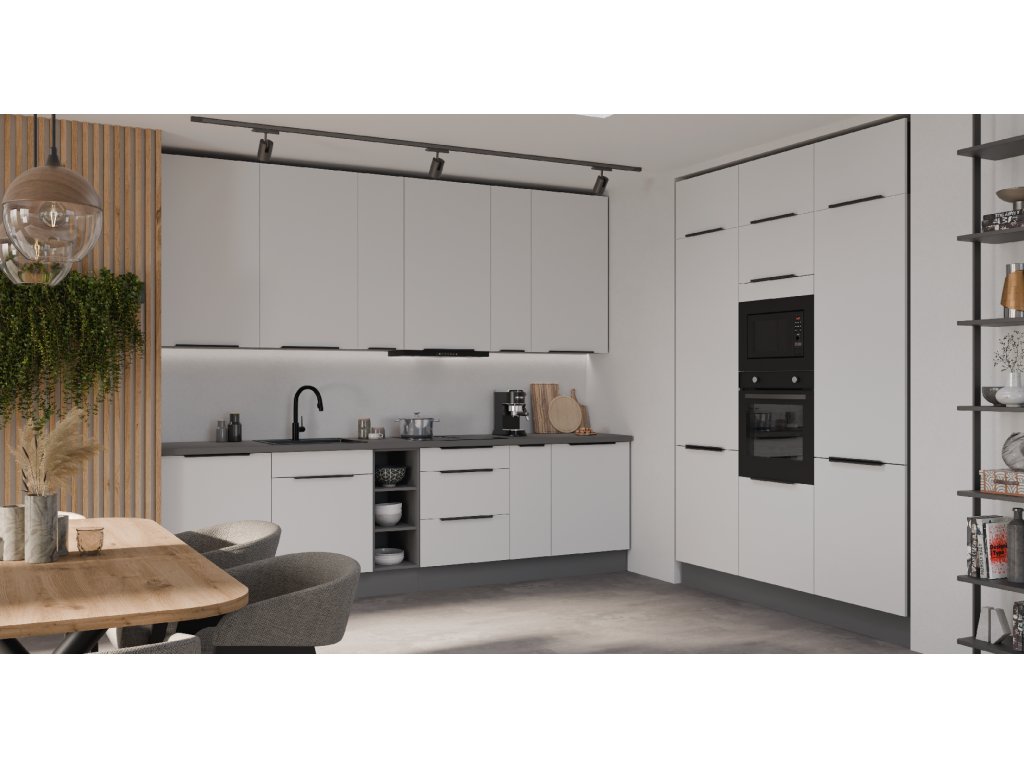 Moderní sektorová kuchyňská linka Aria WH/ANT je v barevném provedení Antracit (korpus) a bílý mat (dvířka). Tato linka má atraktivní design díky moderním výškově nastavitelným nožkám a je tak ideální volbou při výběru Vaší kuchyně. U skříněk s výklopem se dvířka zvedají pomocí plynových pístů, Cargo skříňky jsou výsuvné, všechny ostatní skříňky (mimo rohových) a zásuvky jsou opatřeny SYSTÉMEM TICHÉHO DOVÍRÁNÍ. Úchytky jsou hliníkové černé. Na předních stranách tohoto nábytku (dvířka/zásuvky) má linka speciální povrchovou úpravu Anti Finger Print, nezanechávající otisky prstů.