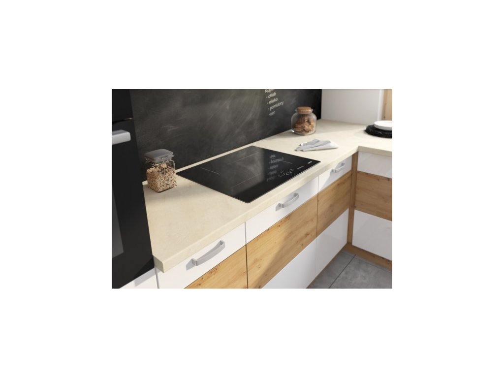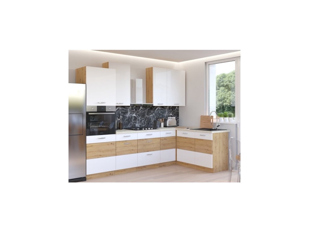 Moderní kuchyňská linka v barevném provedení dub Artisan (korpus) a bílý lesk (dvířka). Tato linka má atraktivní design a je tak ideální volbou při výběru Vaší kuchyně. U skříněk s výklopem se dvířka zvedají pomocí plynových pístů, Cargo skříňky jsou výsuvné, všechny ostatní skříňky (mimo rohových) a zásuvky jsou opatřeny SYSTÉMEM TICHÉHO DOVÍRÁNÍ. Úchytky jsou kovové.