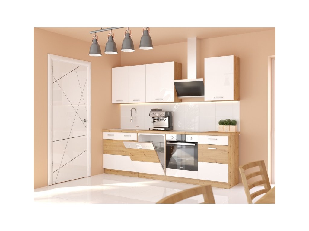 Moderní kuchyňská linka v barevném provedení dub Artisan (korpus) a bílý lesk (dvířka). Tato linka má atraktivní design a je tak ideální volbou při výběru Vaší kuchyně. U skříněk s výklopem se dvířka zvedají pomocí plynových pístů, Cargo skříňky jsou výsuvné, všechny ostatní skříňky (mimo rohových) a zásuvky jsou opatřeny SYSTÉMEM TICHÉHO DOVÍRÁNÍ. Úchytky jsou kovové.