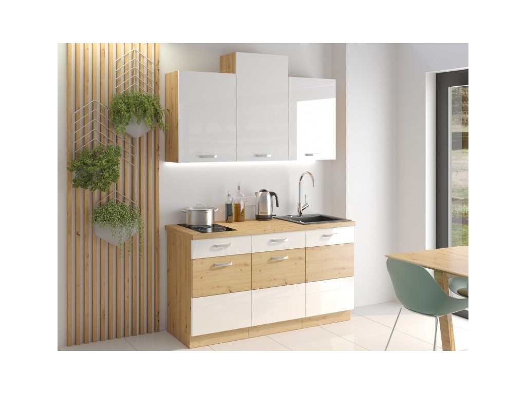Moderní kuchyňská linka v barevném provedení dub Artisan (korpus) a bílý lesk (dvířka). Tato linka má atraktivní design a je tak ideální volbou při výběru Vaší kuchyně. U skříněk s výklopem se dvířka zvedají pomocí plynových pístů, Cargo skříňky jsou výsuvné, všechny ostatní skříňky (mimo rohových) a zásuvky jsou opatřeny SYSTÉMEM TICHÉHO DOVÍRÁNÍ. Úchytky jsou kovové.