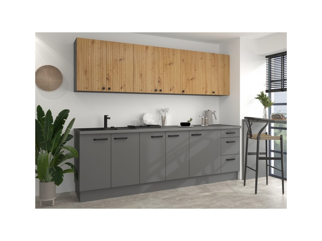 Moderní kuchyňská linka v barevném provedení Antracit (korpus/dvířka spodních skříněk) a dub Artisan (dvířka horních dvířek - lamely). Tato linka má atraktivní design díky moderním výškově nastavitelným nožkám a je tak ideální volbou při výběru Vaší kuchyně. U skříněk s výklopem se dvířka zvedají pomocí plynových pístů, Cargo skříňky jsou výsuvné, všechny ostatní skříňky (mimo rohových) a zásuvky jsou opatřeny SYSTÉMEM TICHÉHO DOVÍRÁNÍ.