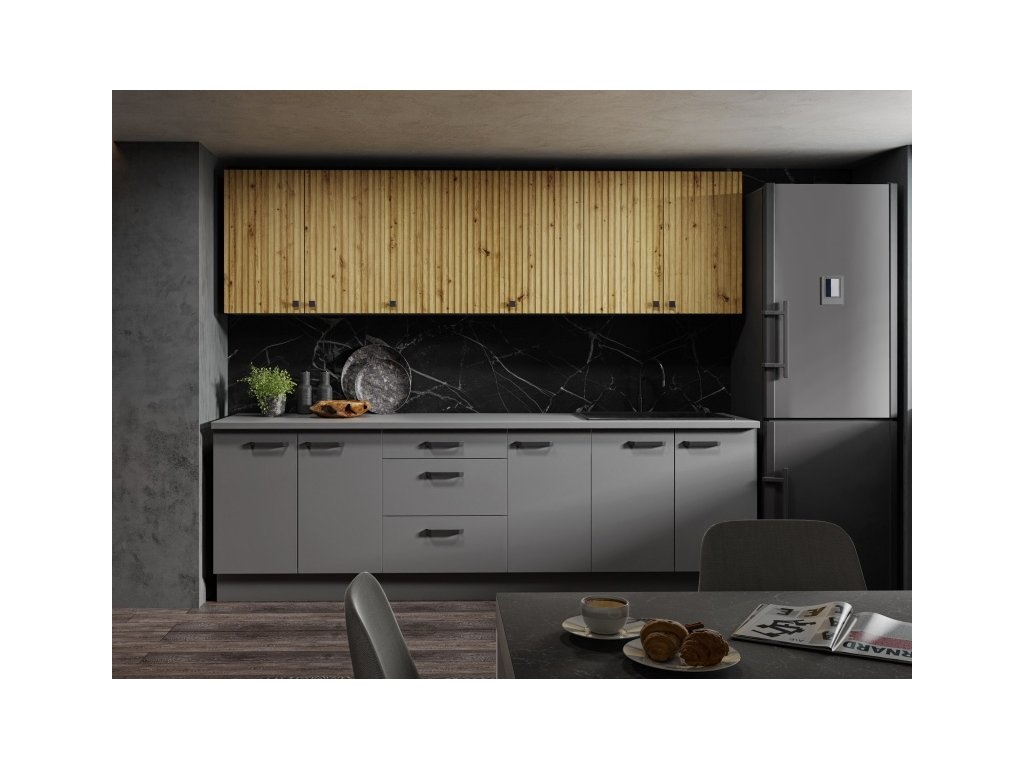 Moderní kuchyňská linka v barevném provedení Antracit (korpus/dvířka spodních skříněk) a dub Artisan (dvířka horních dvířek - lamely). Tato linka má atraktivní design díky moderním výškově nastavitelným nožkám a je tak ideální volbou při výběru Vaší kuchyně. U skříněk s výklopem se dvířka zvedají pomocí plynových pístů, Cargo skříňky jsou výsuvné, všechny ostatní skříňky (mimo rohových) a zásuvky jsou opatřeny SYSTÉMEM TICHÉHO DOVÍRÁNÍ.
