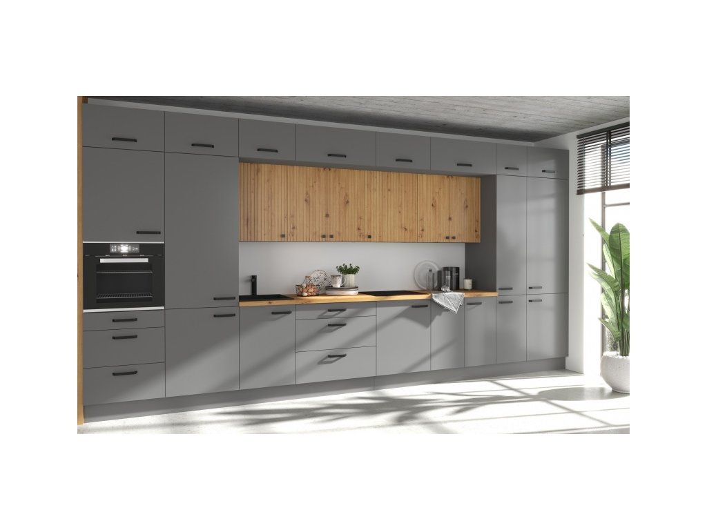 Moderní kuchyňská linka v barevném provedení Antracit (korpusy + dvířka spodních skříněk + dvířka horních výklopových skříněk) a dub Artisan (dvířka horních dvířek - lamely). Tato linka má atraktivní design díky moderním výškově nastavitelným nožkám a je tak ideální volbou při výběru Vaší kuchyně. U skříněk s výklopem se dvířka zvedají pomocí plynových pístů, Cargo skříňky jsou výsuvné, všechny ostatní skříňky (mimo rohových) a zásuvky jsou opatřeny SYSTÉMEM TICHÉHO DOVÍRÁNÍ.