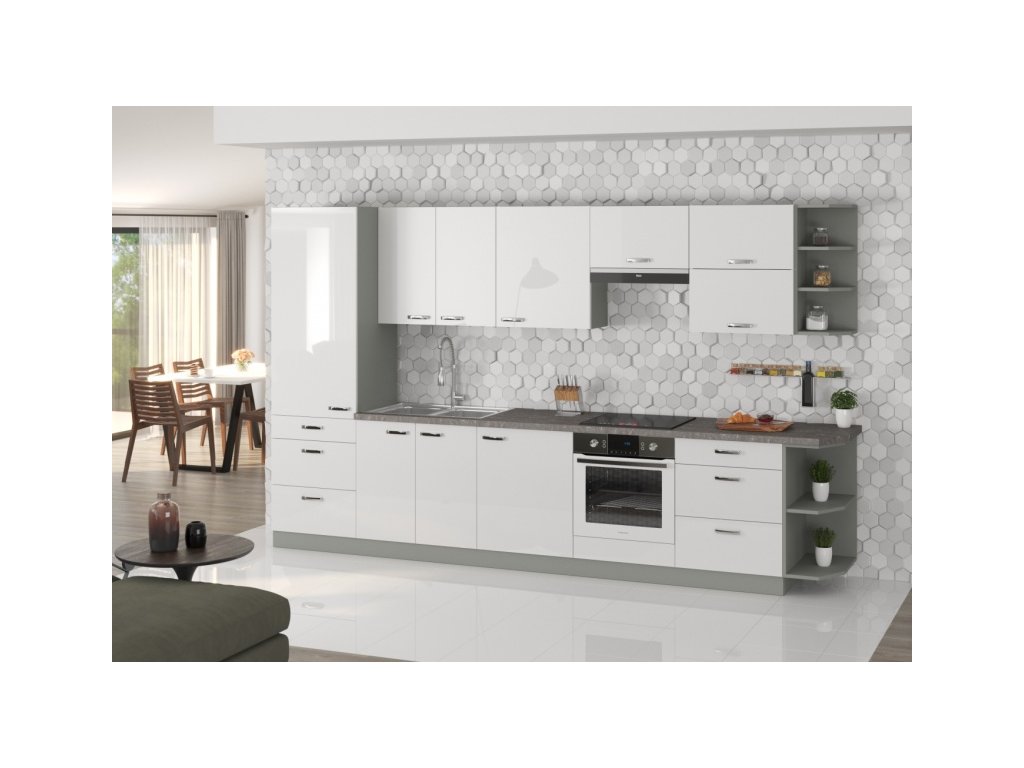 Moderní kuchyňská linka, která má šedý korpus a dvířka v bílém lesku. Tato linka má atraktivní design a je tak ideální volbou při výběru Vaší kuchyně. U skříněk s výklopem se dvířka zvedají pomocí plynových pístů, Cargo skříňky jsou výsuvné, ostatní skříňky (mimo rohových) a zásuvky u skříněk 40 D 4S, 60 D 3S a 80 D 3S jsou opatřeny SYSTÉMEM TICHÉHO DOVÍRÁNÍ. Úchytky jsou kovové.