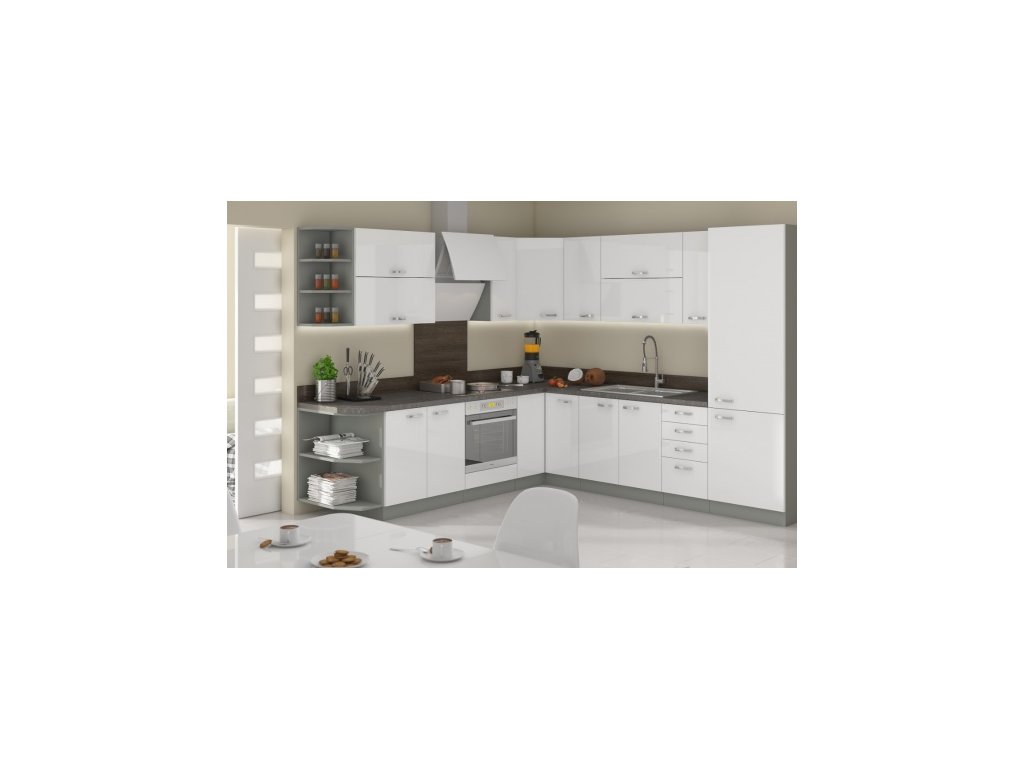 Moderní kuchyňská linka, která má šedý korpus a dvířka v bílém lesku. Tato linka má atraktivní design a je tak ideální volbou při výběru Vaší kuchyně. U skříněk s výklopem se dvířka zvedají pomocí plynových pístů, Cargo skříňky jsou výsuvné, ostatní skříňky (mimo rohových) a zásuvky u skříněk 40 D 4S, 60 D 3S a 80 D 3S jsou opatřeny SYSTÉMEM TICHÉHO DOVÍRÁNÍ. Úchytky jsou kovové.