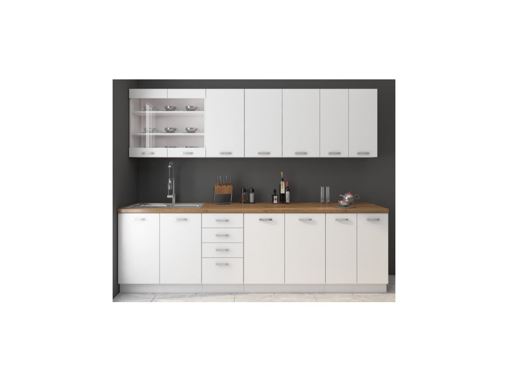 je součástí moderní sektorové kuchyňské linky Eko White, která je v atraktivním designu a je tak ideální volbou při výběru Vaší kuchyně. Linka má korpus v odstínu bílý mat a taktéž i dvířka skříněk jsou v tomto odstínu. U skříněk s výklopem se dvířka zvedají pomocí plynových pístů, úchytky jsou plastové.