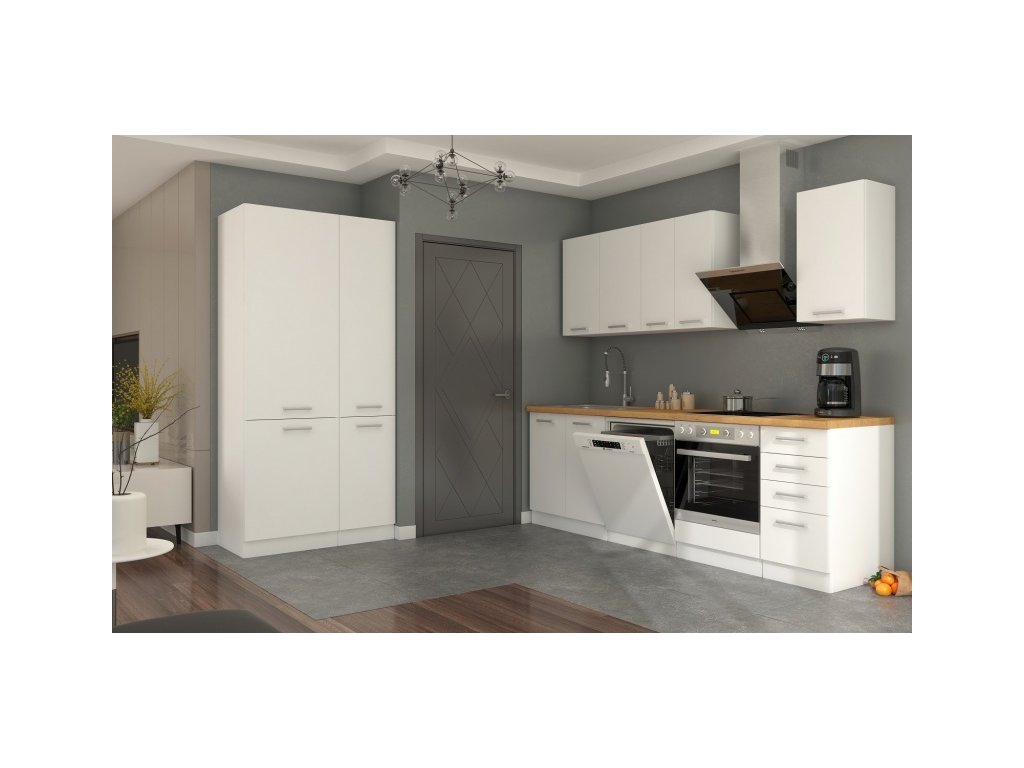 je součástí moderní sektorové kuchyňské linky Eko White, která je v atraktivním designu a je tak ideální volbou při výběru Vaší kuchyně. Linka má korpus v odstínu bílý mat a taktéž i dvířka skříněk jsou v tomto odstínu. U skříněk s výklopem se dvířka zvedají pomocí plynových pístů, úchytky jsou plastové.