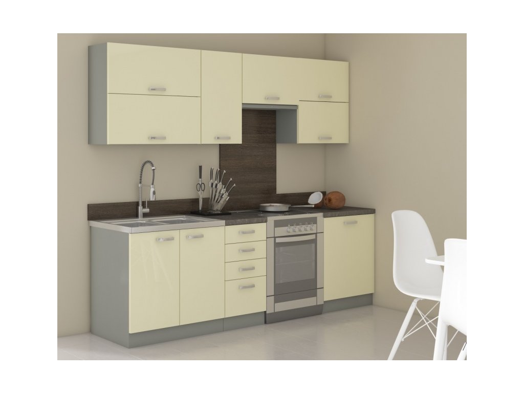 Moderní kuchyňská linka, která má šedý korpus a dvířka v krémovém lesku. Tato linka má atraktivní design a je tak ideální volbou při výběru Vaší kuchyně. U skříněk s výklopem se dvířka zvedají pomocí plynových pístů, Cargo skříňky jsou výsuvné, ostatní skříňky (mimo rohových) a zásuvky u skříněk 40 D 4S, 60 D 3S a 80 D 3S jsou opatřeny SYSTÉMEM TICHÉHO DOVÍRÁNÍ. Úchytky jsou kovové.