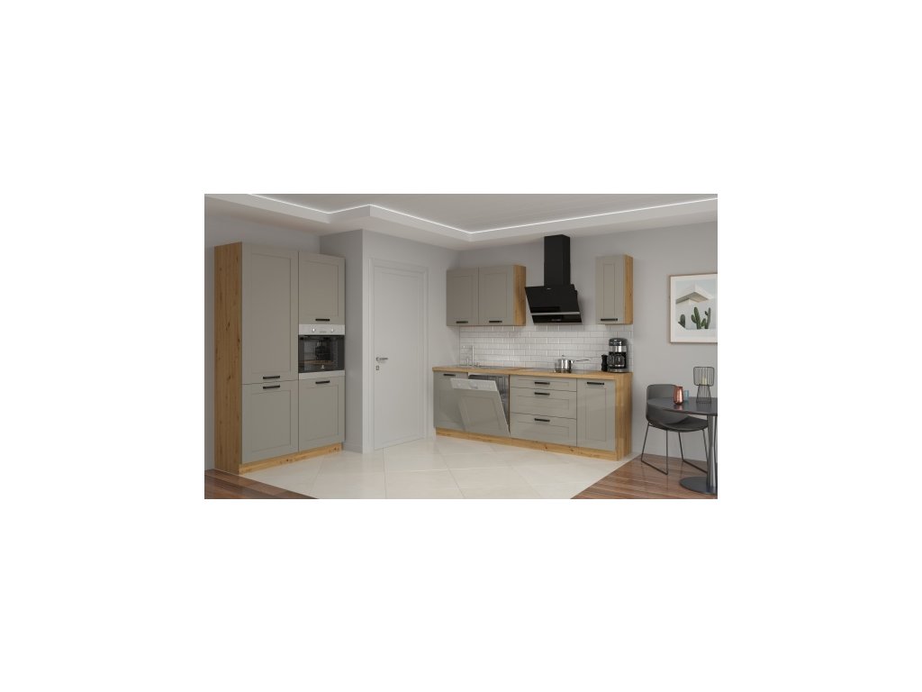 Moderní kuchyňská linka v barevném provedení dub Artisan (korpus) a MDF ClayGrey (dvířka s prolisy). Tato linka má atraktivní design a je tak ideální volbou při výběru Vaší kuchyně. U skříněk s výklopem se dvířka zvedají pomocí plynových pístů, Cargo skříňky jsou výsuvné, všechny ostatní skříňky (mimo rohových) a zásuvky jsou opatřeny SYSTÉMEM TICHÉHO DOVÍRÁNÍ. Úchytky jsou kovové.