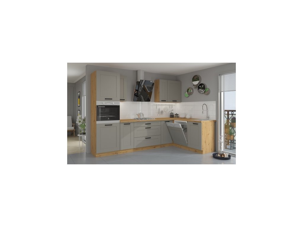 Moderní kuchyňská linka v barevném provedení dub Artisan (korpus) a MDF ClayGrey (dvířka s prolisy). Tato linka má atraktivní design a je tak ideální volbou při výběru Vaší kuchyně. U skříněk s výklopem se dvířka zvedají pomocí plynových pístů, Cargo skříňky jsou výsuvné, všechny ostatní skříňky (mimo rohových) a zásuvky jsou opatřeny SYSTÉMEM TICHÉHO DOVÍRÁNÍ. Úchytky jsou kovové.