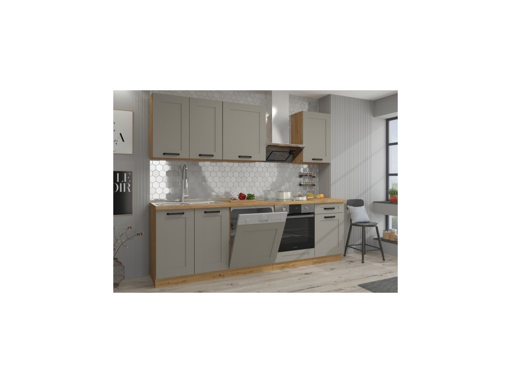 Moderní kuchyňská linka v barevném provedení dub Artisan (korpus) a MDF ClayGrey (dvířka s prolisy). Tato linka má atraktivní design a je tak ideální volbou při výběru Vaší kuchyně. U skříněk s výklopem se dvířka zvedají pomocí plynových pístů, Cargo skříňky jsou výsuvné, všechny ostatní skříňky (mimo rohových) a zásuvky jsou opatřeny SYSTÉMEM TICHÉHO DOVÍRÁNÍ. Úchytky jsou kovové.