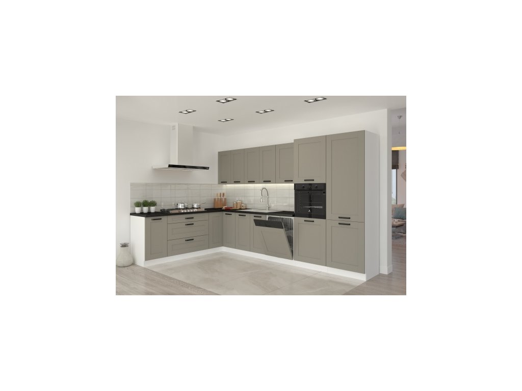 Moderní kuchyňská linka v barevném provedení bílý mat (korpus) a MDF ClayGrey (dvířka s prolisy). Tato linka má atraktivní design a je tak ideální volbou při výběru Vaší kuchyně. U skříněk s výklopem se dvířka zvedají pomocí plynových pístů, Cargo skříňky jsou výsuvné, všechny ostatní skříňky (mimo rohových) a zásuvky jsou opatřeny SYSTÉMEM TICHÉHO DOVÍRÁNÍ. Úchytky jsou kovové.
