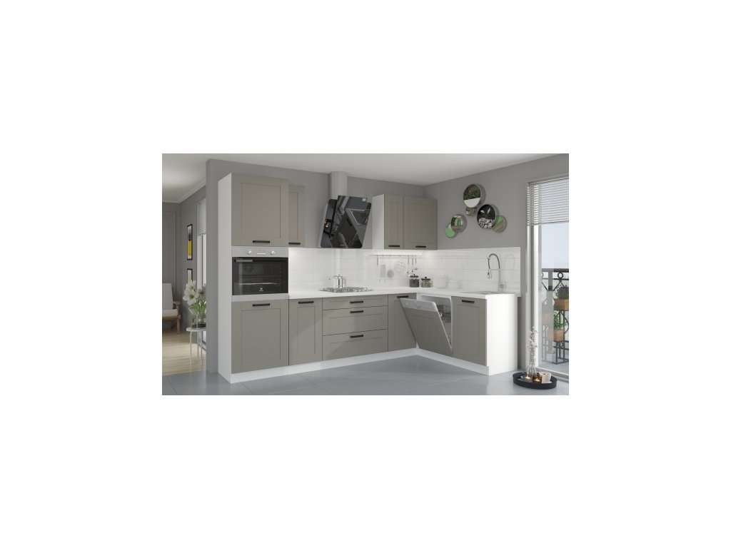 Moderní kuchyňská linka v barevném provedení bílý mat (korpus) a MDF ClayGrey (dvířka s prolisy). Tato linka má atraktivní design a je tak ideální volbou při výběru Vaší kuchyně. U skříněk s výklopem se dvířka zvedají pomocí plynových pístů, Cargo skříňky jsou výsuvné, všechny ostatní skříňky (mimo rohových) a zásuvky jsou opatřeny SYSTÉMEM TICHÉHO DOVÍRÁNÍ. Úchytky jsou kovové.