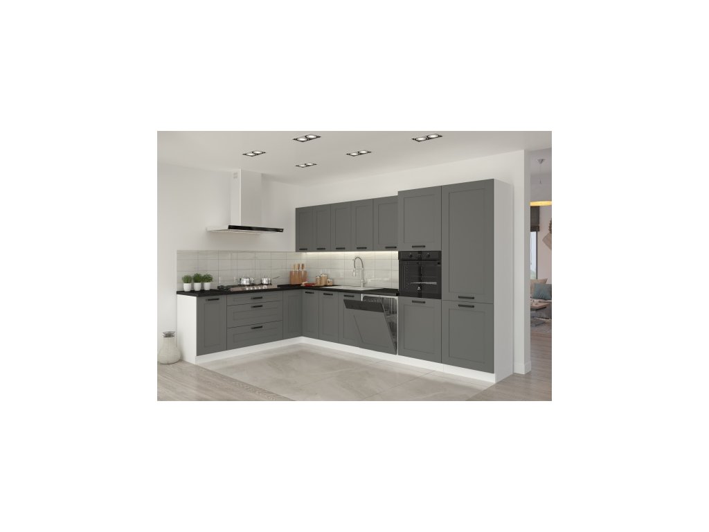 Moderní kuchyňská linka v barevném provedení bílý mat (korpus) a MDF DustGrey (dvířka s prolisy). Tato linka má atraktivní design a je tak ideální volbou při výběru Vaší kuchyně. U skříněk s výklopem se dvířka zvedají pomocí plynových pístů, Cargo skříňky jsou výsuvné, všechny ostatní skříňky (mimo rohových) a zásuvky jsou opatřeny SYSTÉMEM TICHÉHO DOVÍRÁNÍ. Úchytky jsou kovové.