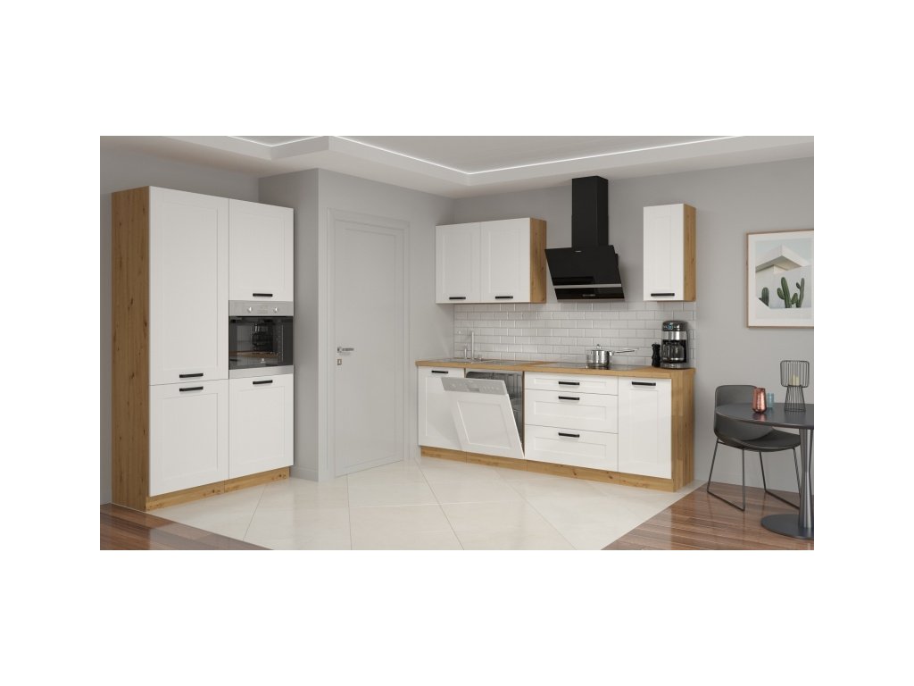 Moderní kuchyňská linka v barevném provedení dub Artisan (korpus) a MDF bílá (dvířka s prolisy). Tato linka má atraktivní design a je tak ideální volbou při výběru Vaší kuchyně. U skříněk s výklopem se dvířka zvedají pomocí plynových pístů, Cargo skříňky jsou výsuvné, všechny ostatní skříňky (mimo rohových) a zásuvky jsou opatřeny SYSTÉMEM TICHÉHO DOVÍRÁNÍ. Úchytky jsou kovové.