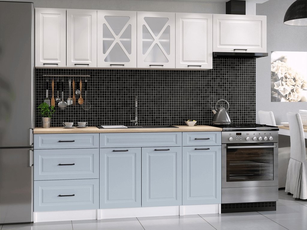 Kuchyňská linka Magda je vyrobená ve venkovském stylu, který se hodí do kuchyně v paneláku i v rodinném domě. Tento styl má jedinečnou schopnost proměnit Vaši kuchyň v útulnou a zároveň funkční místnost, kde bude radost vařit i péct. Kuchyňská linka Magda nabízí dostatek úložného i pracovního prostoru. Všechny skříňky jsou samostatné, takže si je můžete sestavit tak, jak Vám to vyhovuje. Korpusy skříněk jsou vyrobené z lamina 18 mm s hranami ABS a dvířka jsou MDF 16mm. Všechny skříňky jsou dodávány v demontu. Součástí balení je montážní plánek včetně všech potřebných spojovacích prvků. Cena je uvedna za sestavu vyobrazenou na úvodní fotografii BEZ PRACOVNÍ DESKY, s úchytkami, které jsou vyobrazeny v doplňkových fotografiích. Pracovní desku lze dokoupit nad každou skříňku zvlášť podle její šíře. Vyobrazené spotřebiče, dřez, baterie, doplňky a dekorace nejsou v ceně. Kuchyň bude dodaná s bílými korpusy a dvířky v kombinaci bílá a světle modrá.
